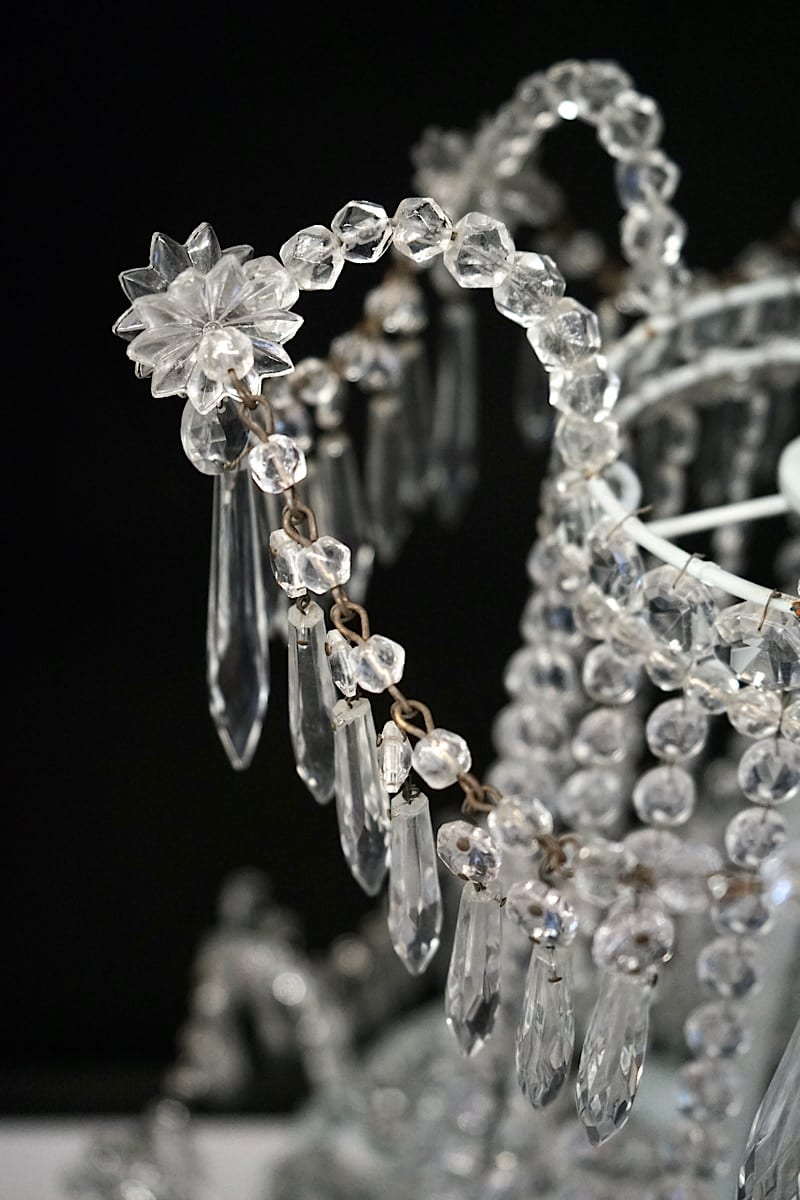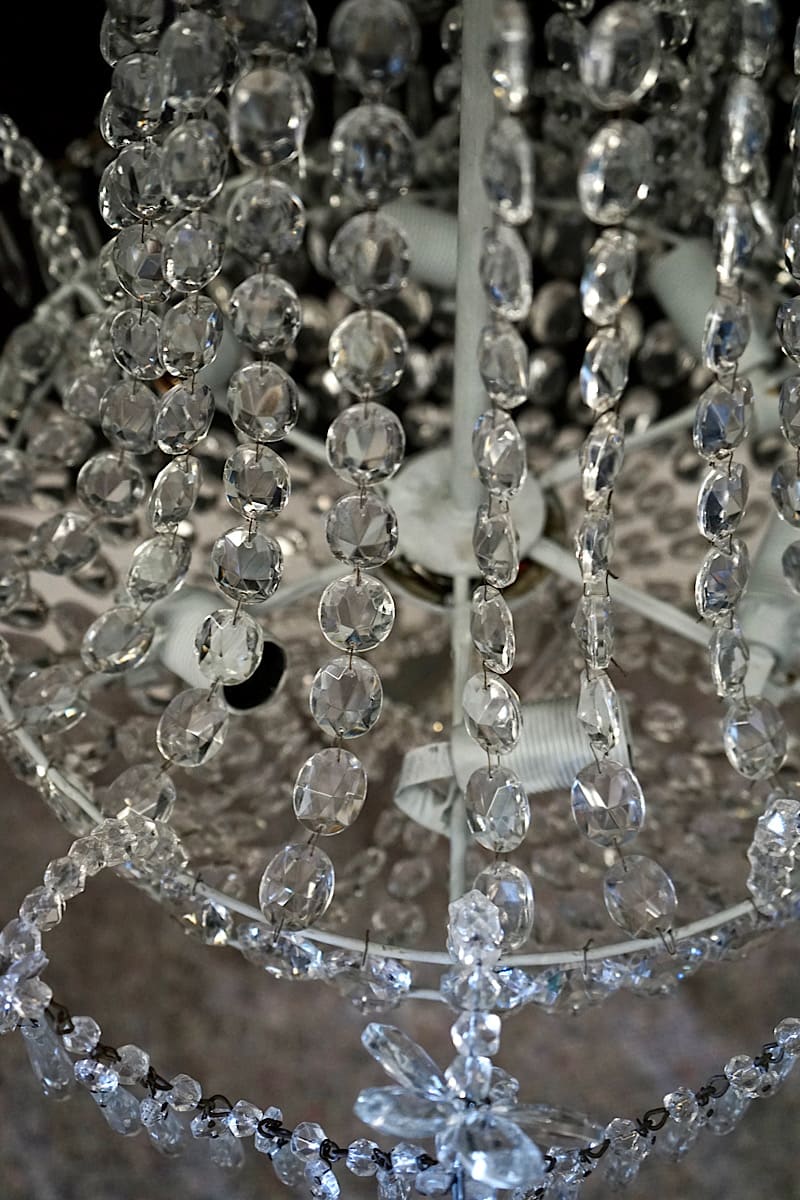 An elegant Louis XVI or neoclassical style cascade chandelier in hand-faceted crystal and glass. Six internal bulb fittings, rewired to NZ standards.