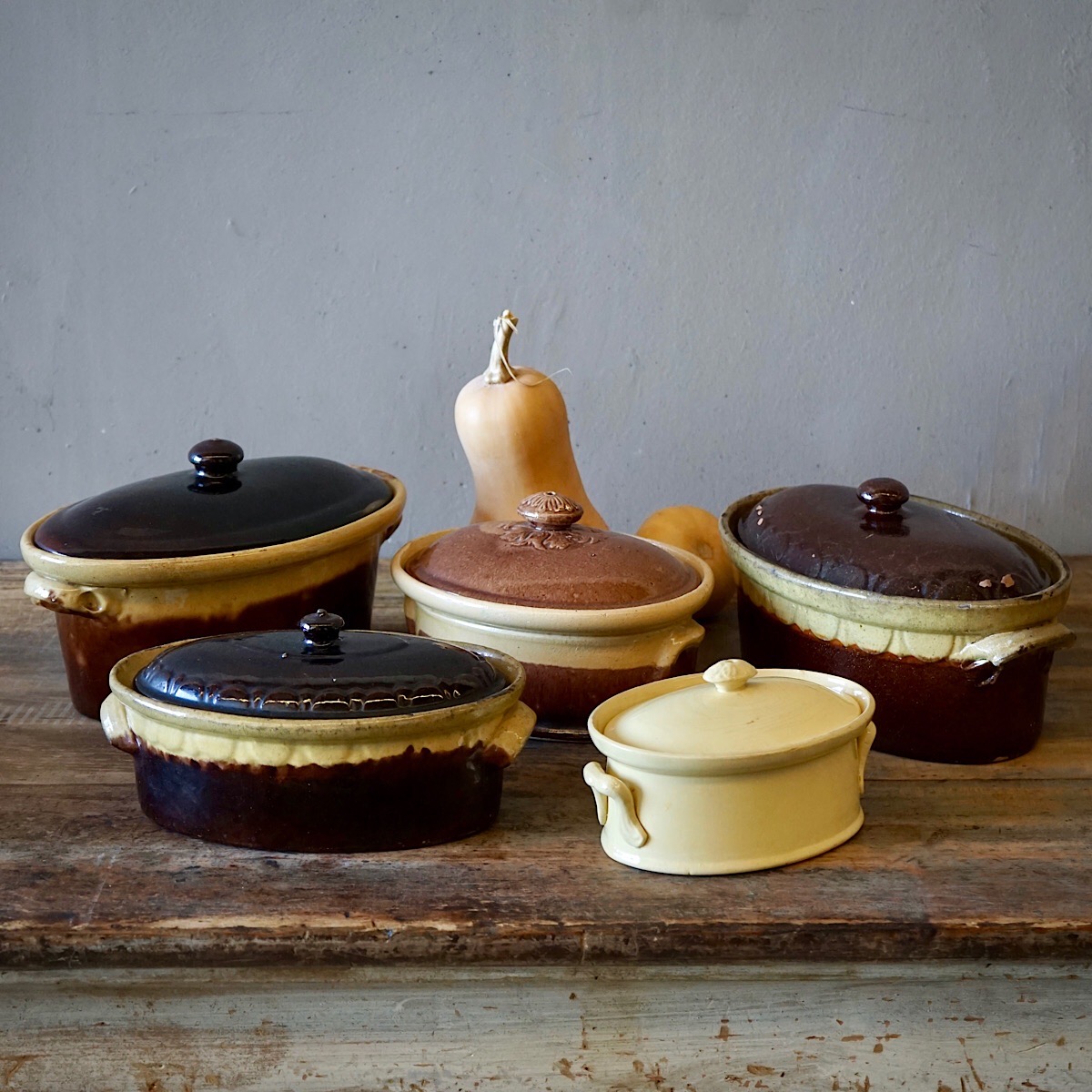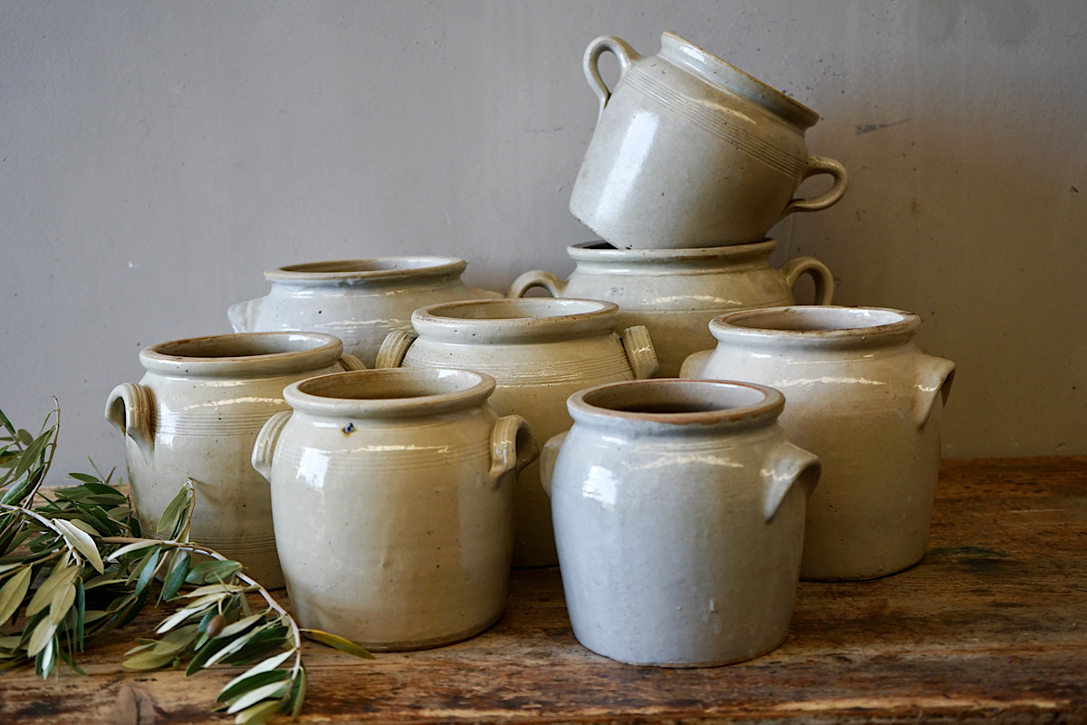 A collection of stoneware confit pots from the South of France. Lovely shape and neutral colour.