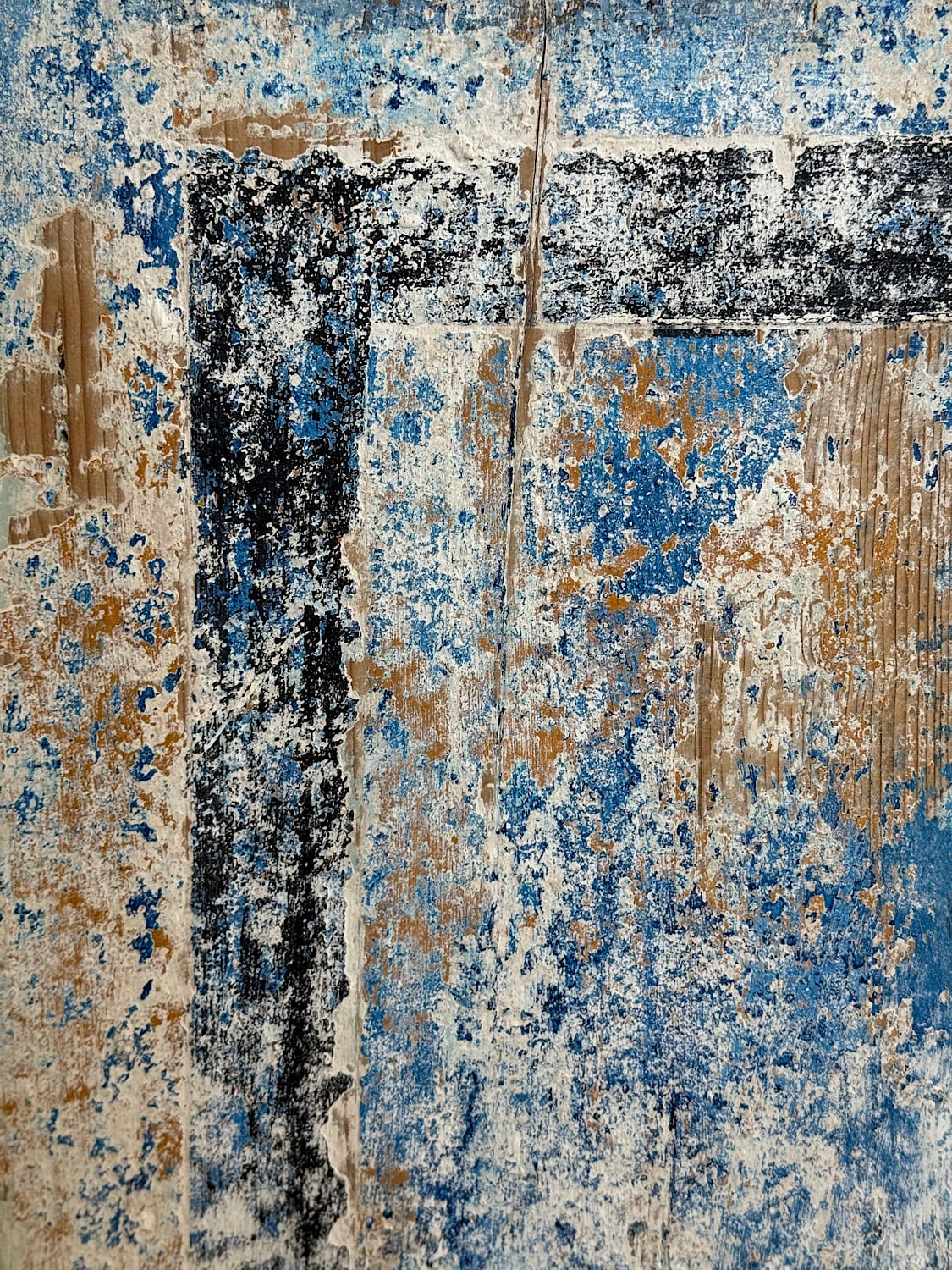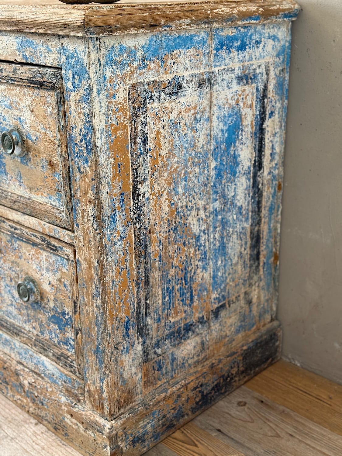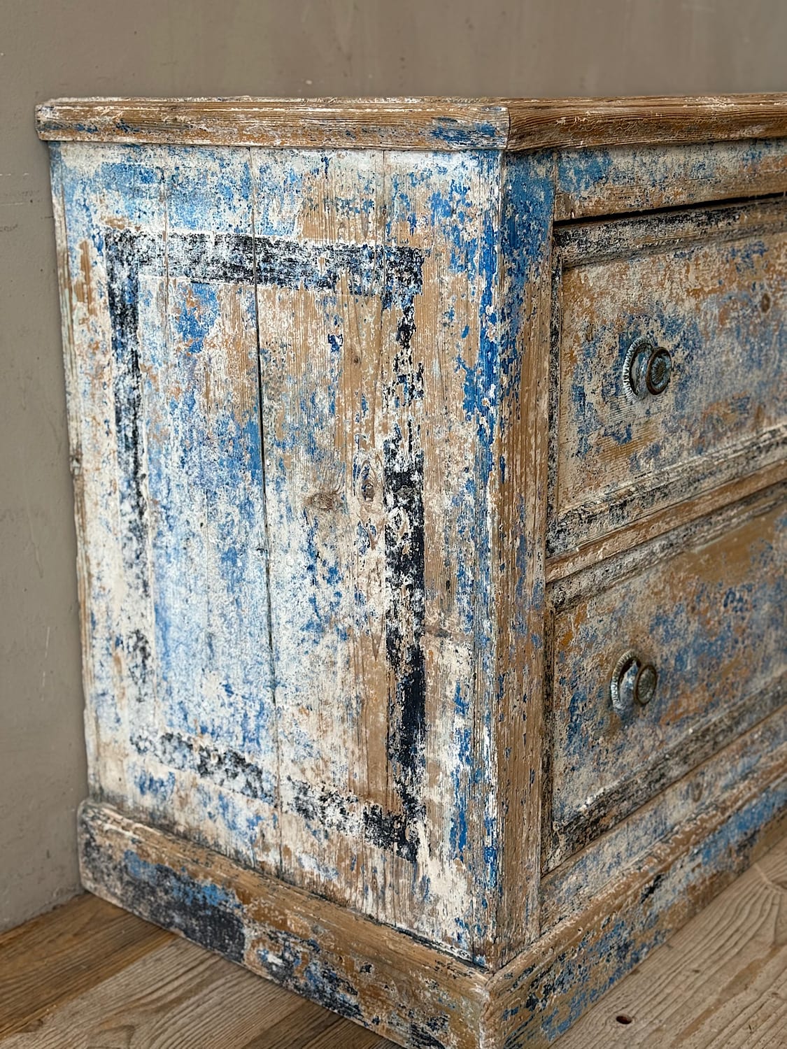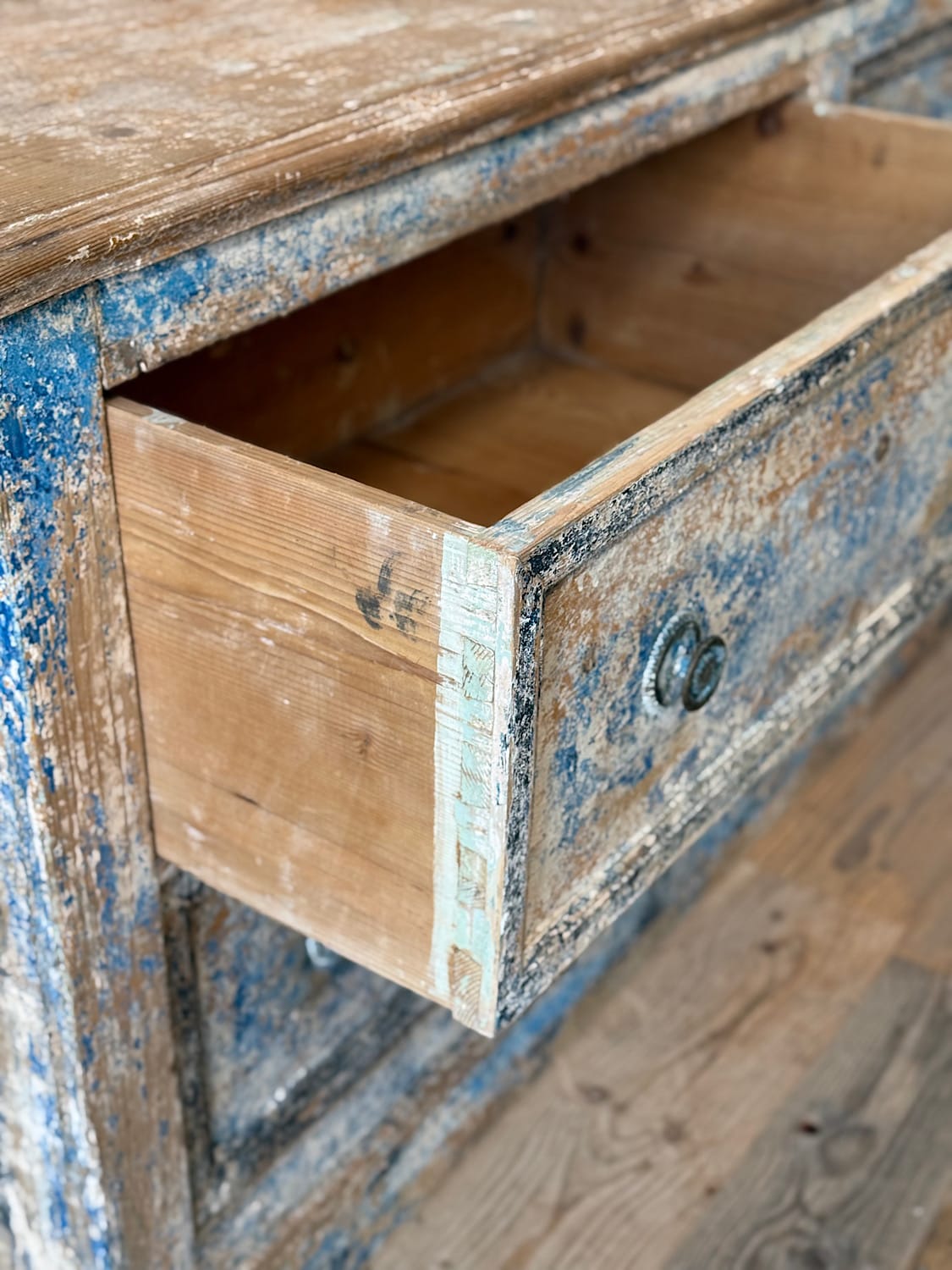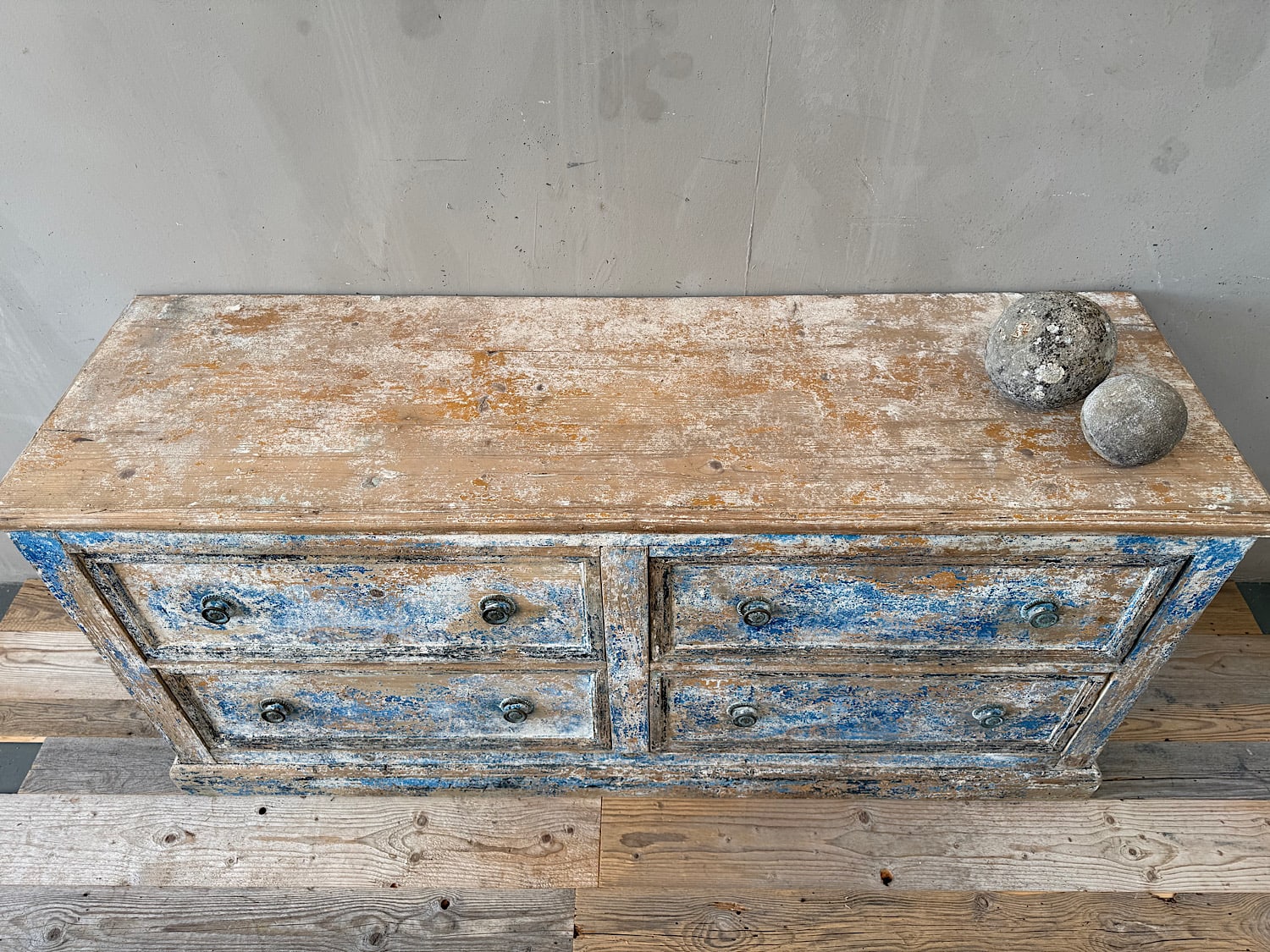 An outstanding bank of drawers from the south of France, with incredible worn paint patina. Four deep drawers with large dovetailed joints and large brass handles. Really needs to be seen in person, to appreciate its colours and presence. A real statement piece, in any interior.