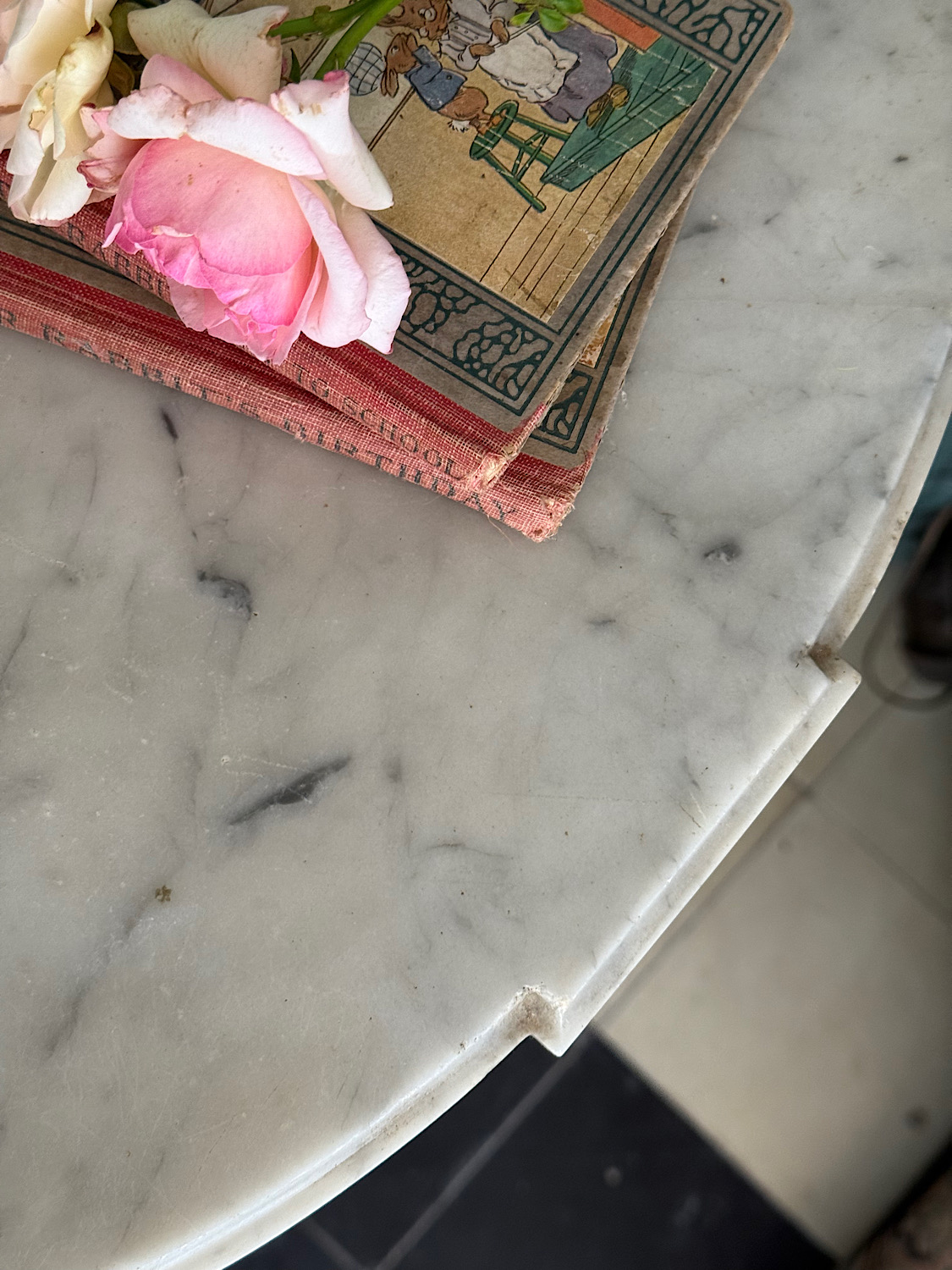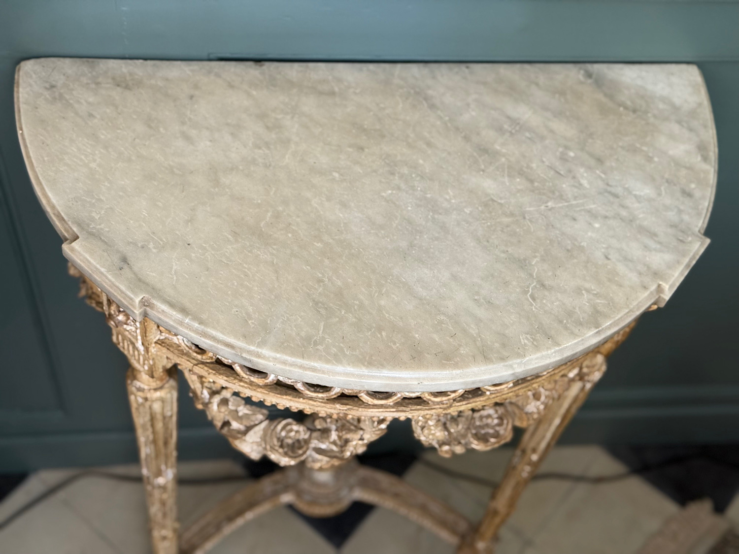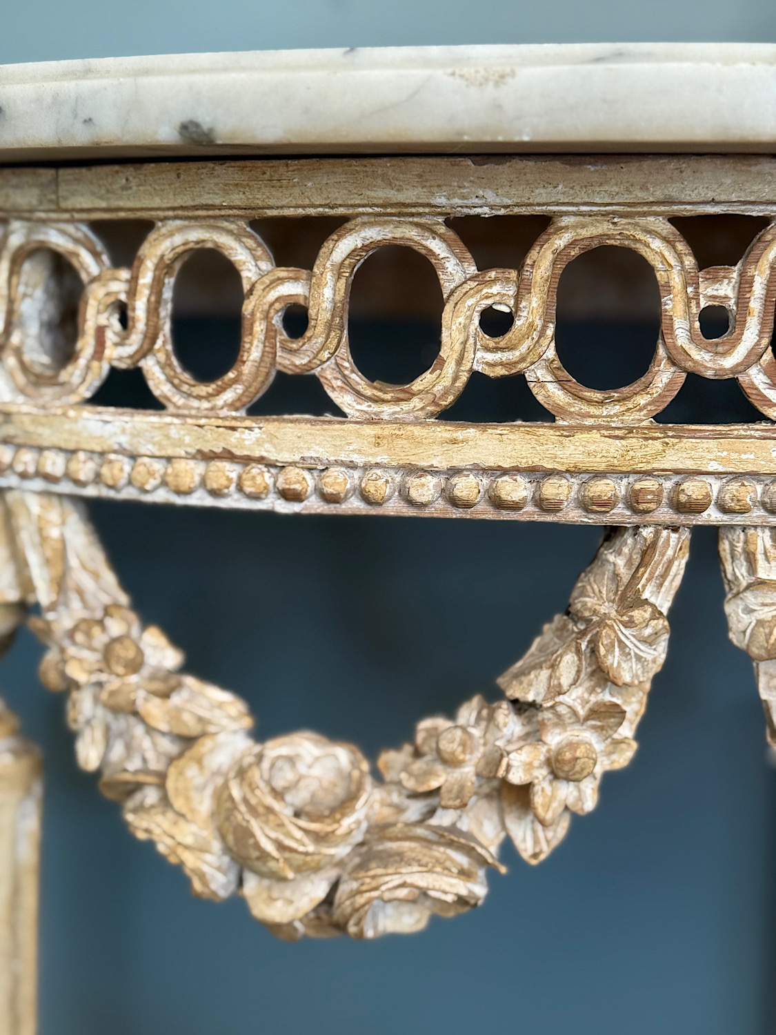 An exceptional pair of small Louis XVI period carved and painted demi-lune console tables. Extremely fine Neoclassical detail, geometric frieze and floral garlands, and a central urn with eternal flame. Original Carrara marble tops with finely shaped edge. Excellent original condition, with original ochre paint showing lovely worn patina. No repairs or retouches. Extremely rare to find in a pair.
