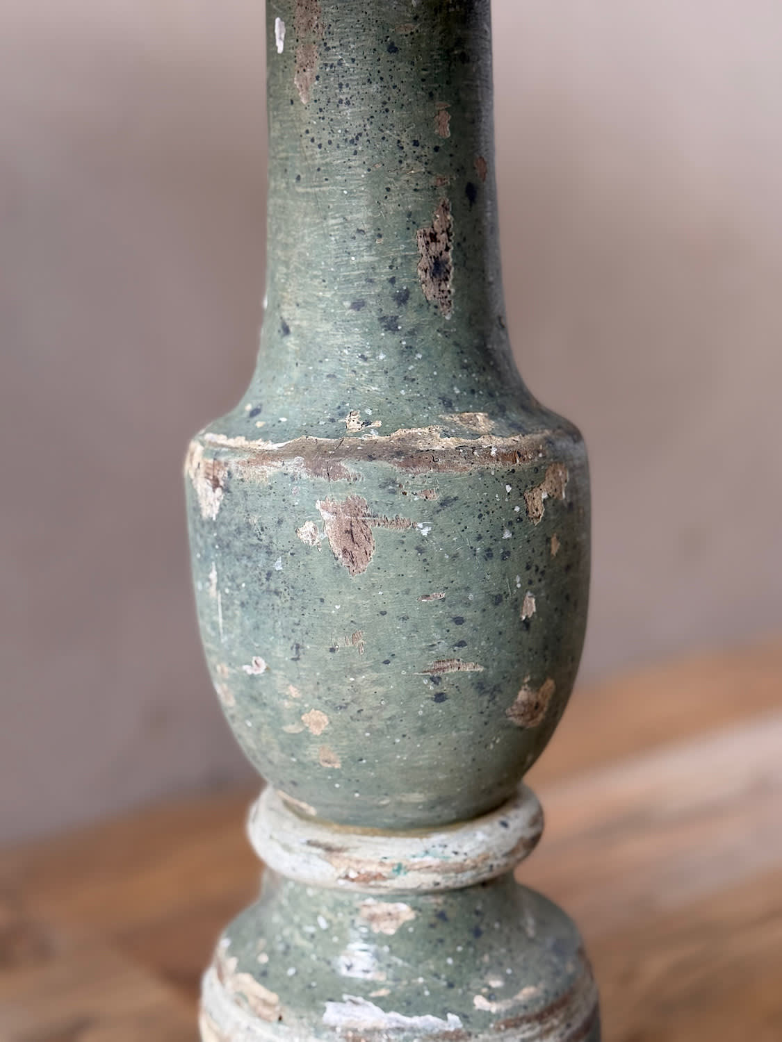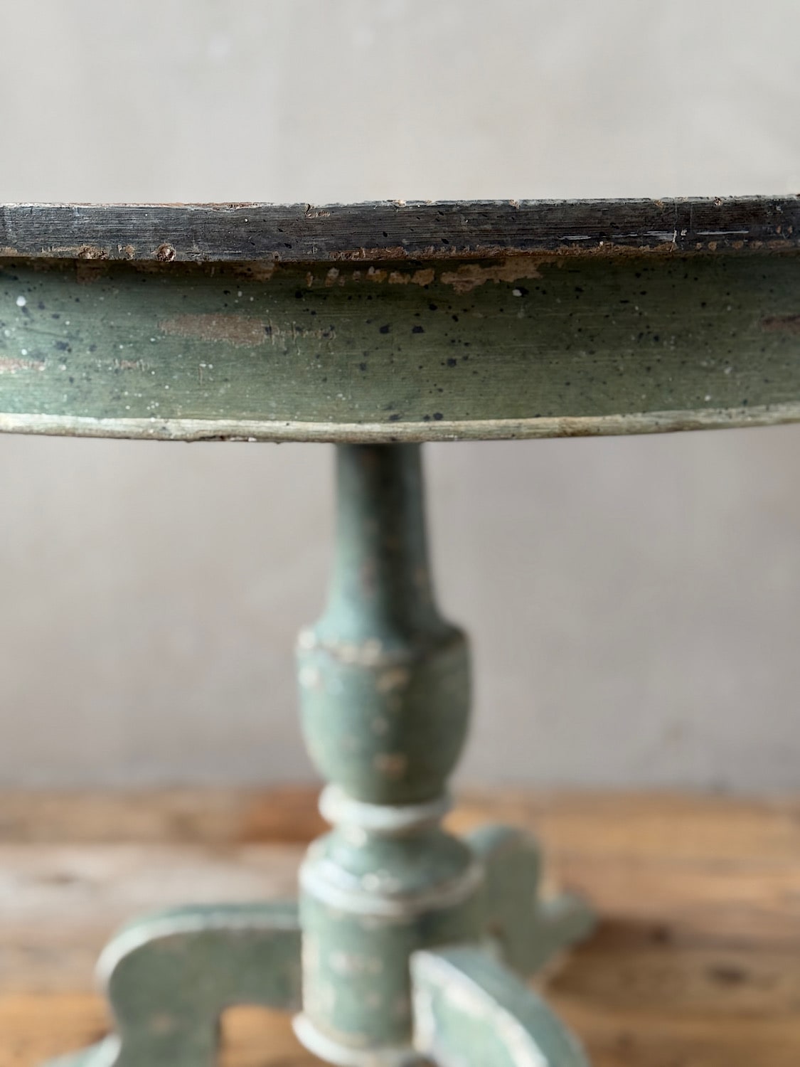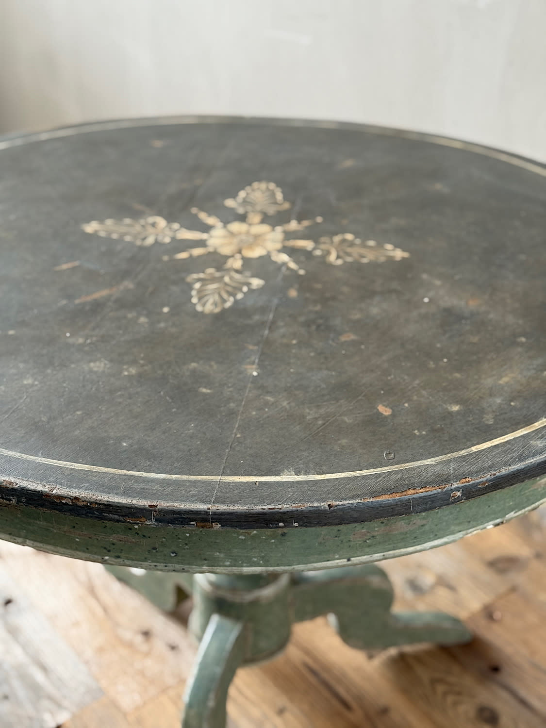 A striking French Empire gueridon or centre table, painted in soft green, with black top and off-white neoclassical decoration. Baluster form central column pedestal on a trefoil base. Fabulous in a traditional or modern setting.