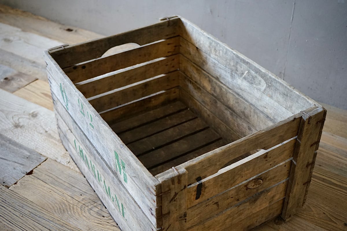 A French wooden travelling chest with its original green paint and old travel labels.