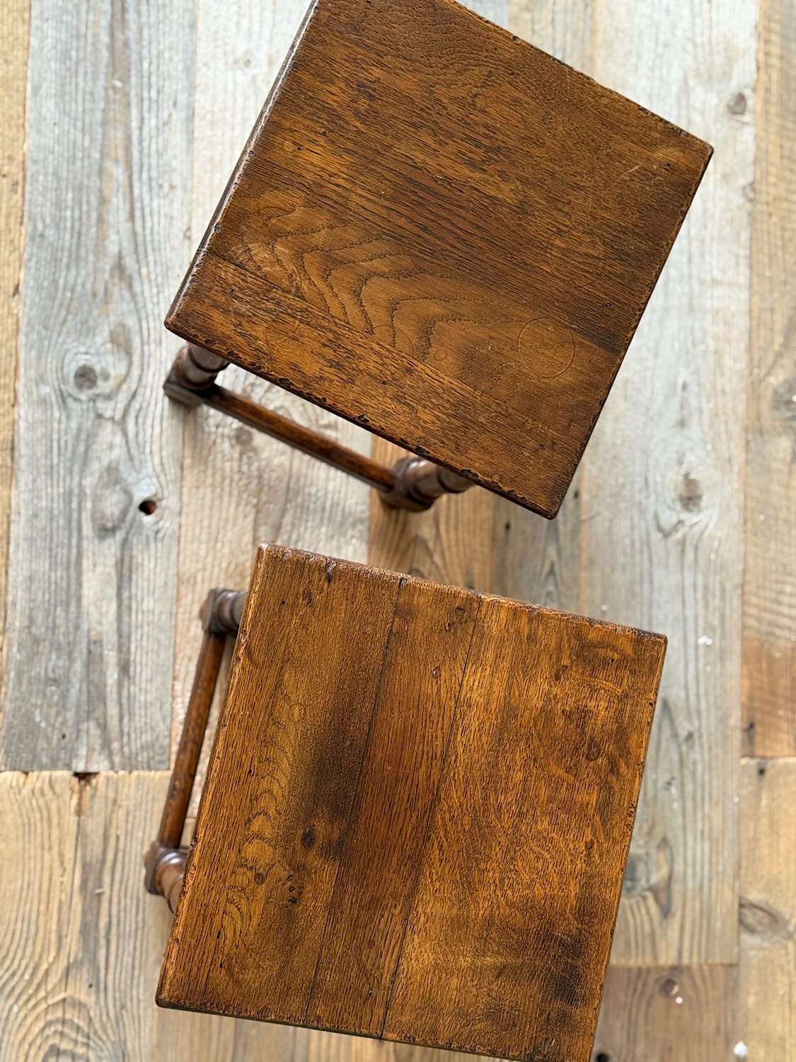 A charming pair of French 19th century small oak stools, perfect as side tables beside a chair or sofa. Lovely original aged patina. Priced and sold as a pair.