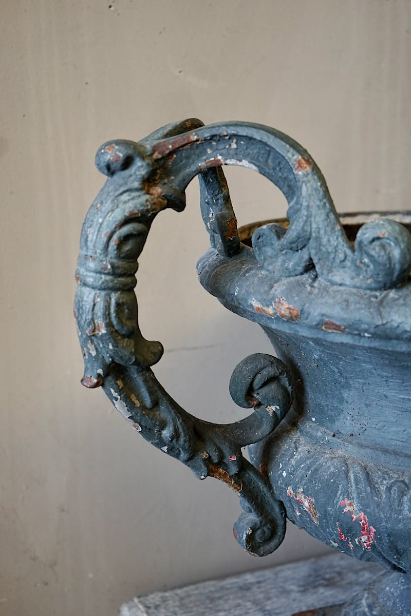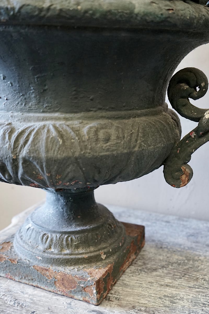 A pair of large French garden urns in reconstituted stone, with gadrooning detail and excellent patina.