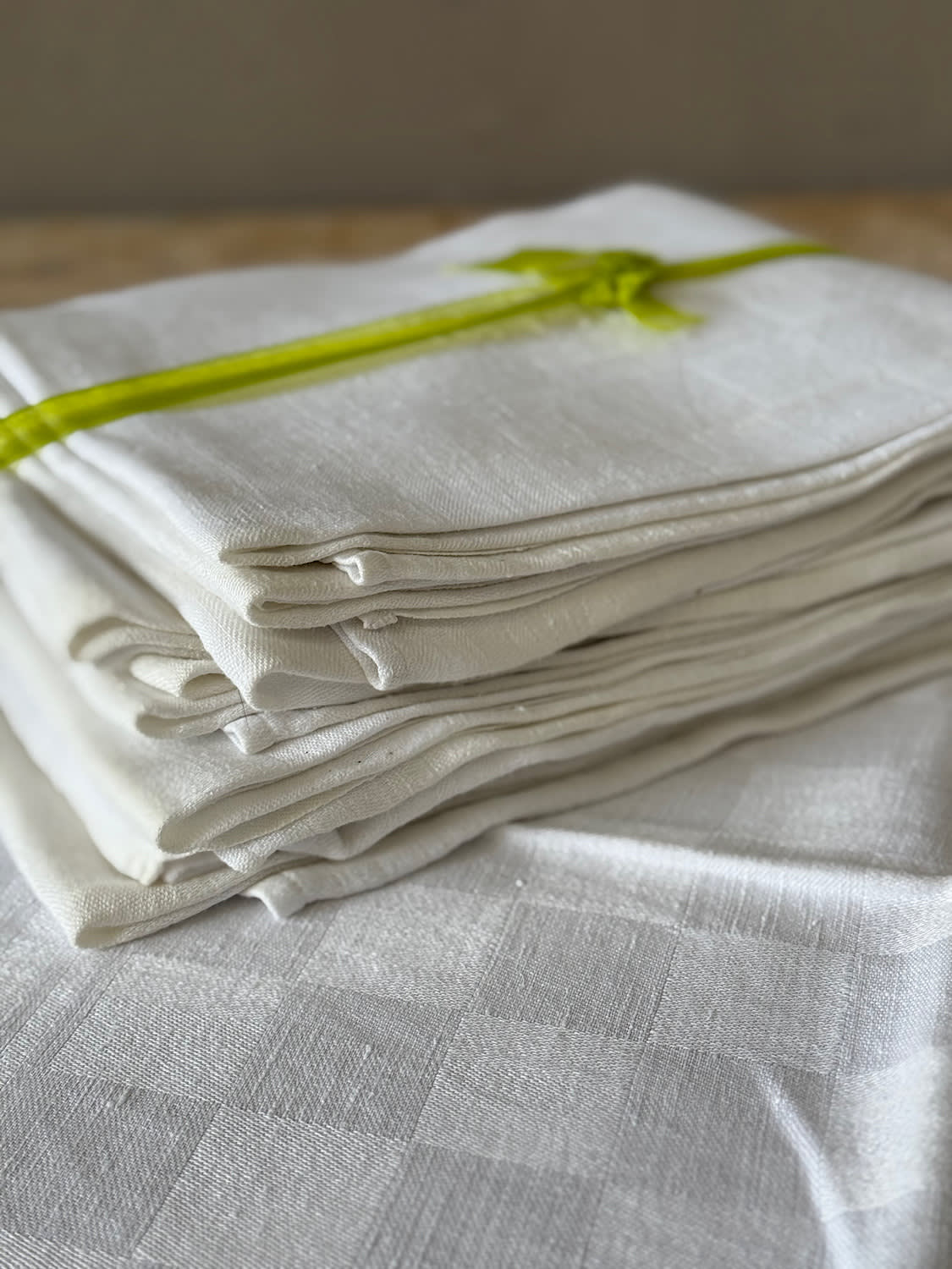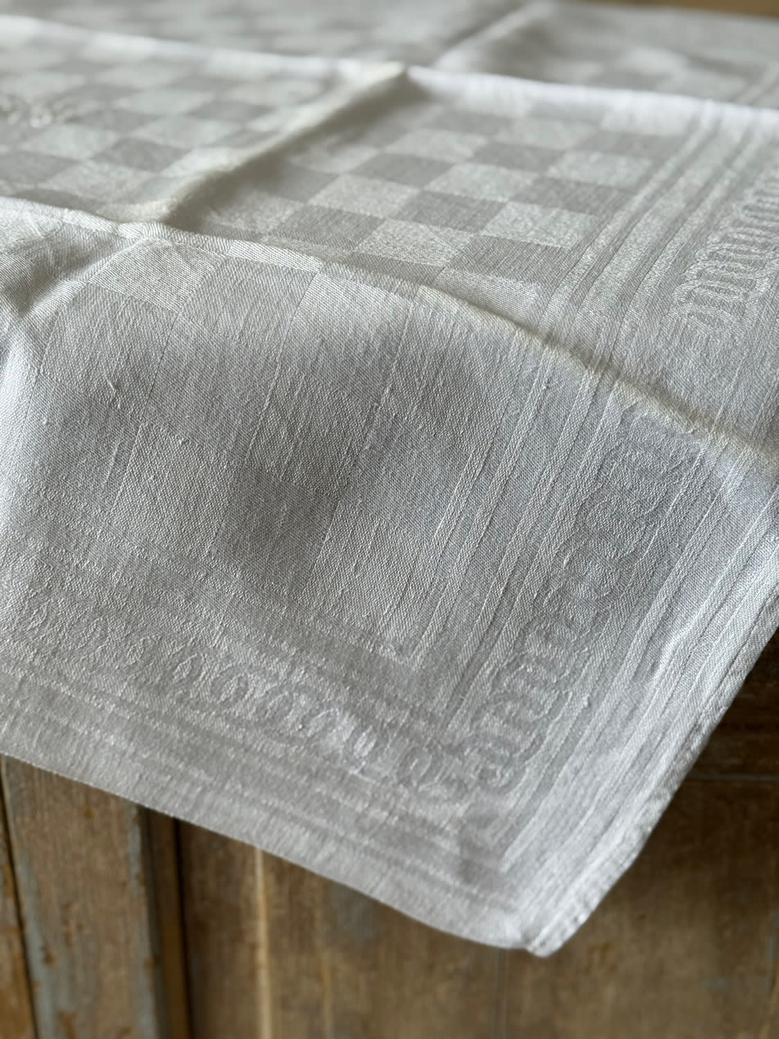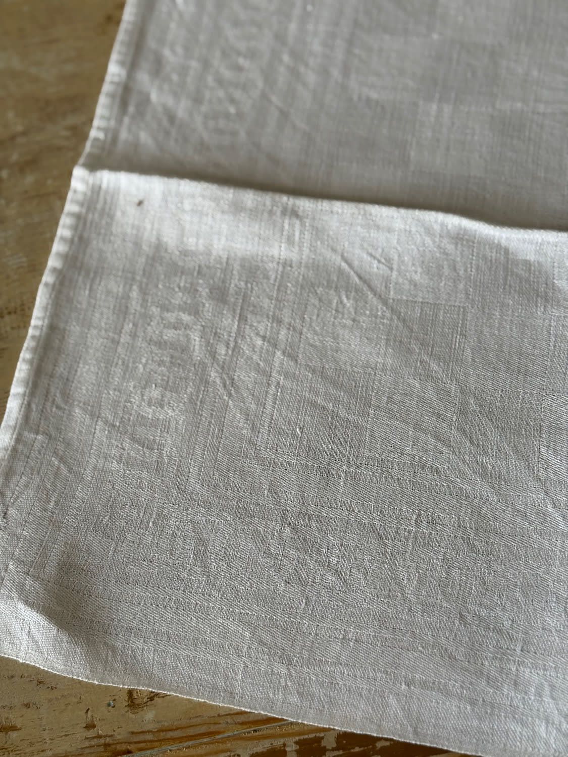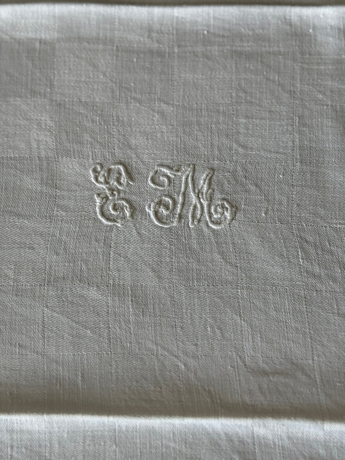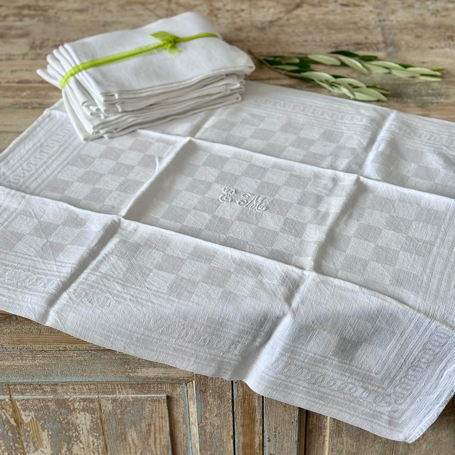 A set of 12 large French linen napkins with woven scrolling jacquard motif. Personalised with the initials DB. All in perfect condition.