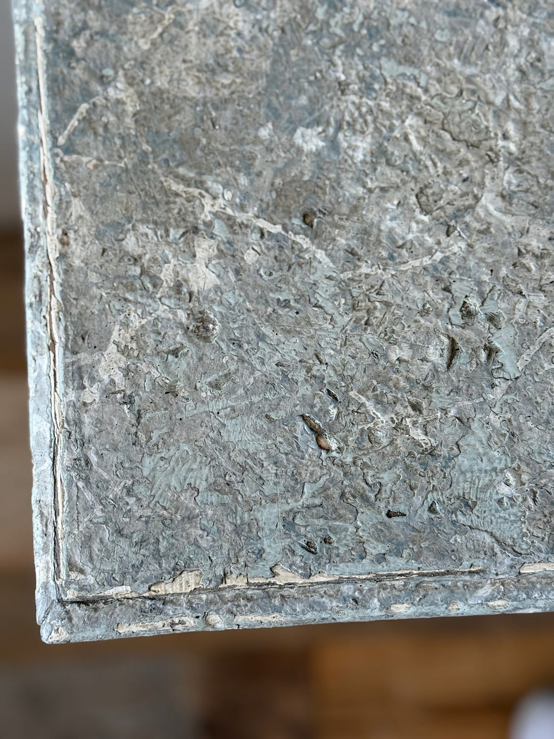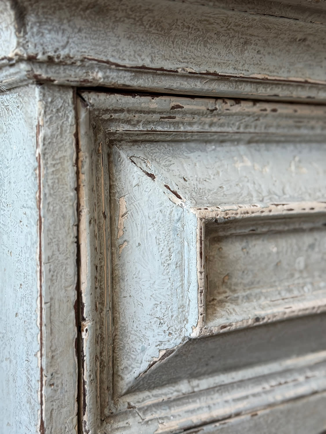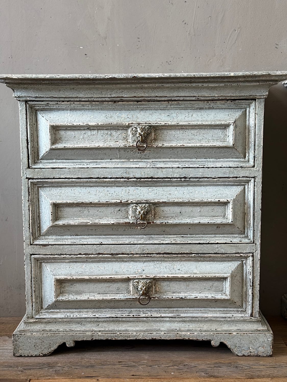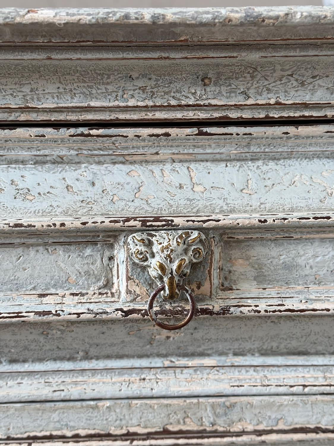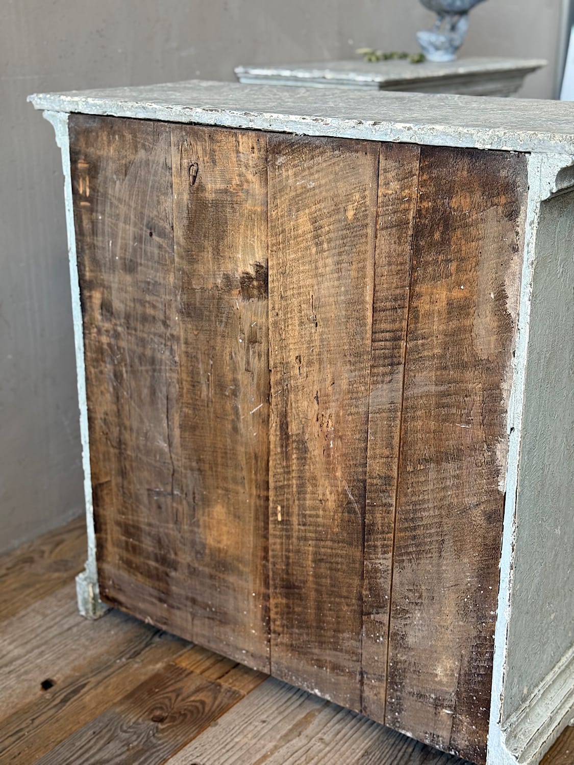 A rare pair of 18th century Italian small commodes or bedside cabinets painted in soft off blue/grey patina with faux marble painted tops. Deeply moulded drawer fronts, with ram’s head brass handles. Rare to find in these smaller proportions and narrow depth. Priced and sold as a pair.