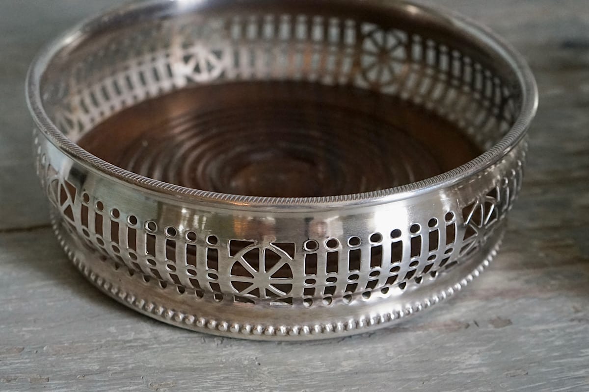Two particularly beautiful antique silver plated wine bottle holders with handles. Silvering in perfect condition. Gorgeous table decoration. Sold separately.