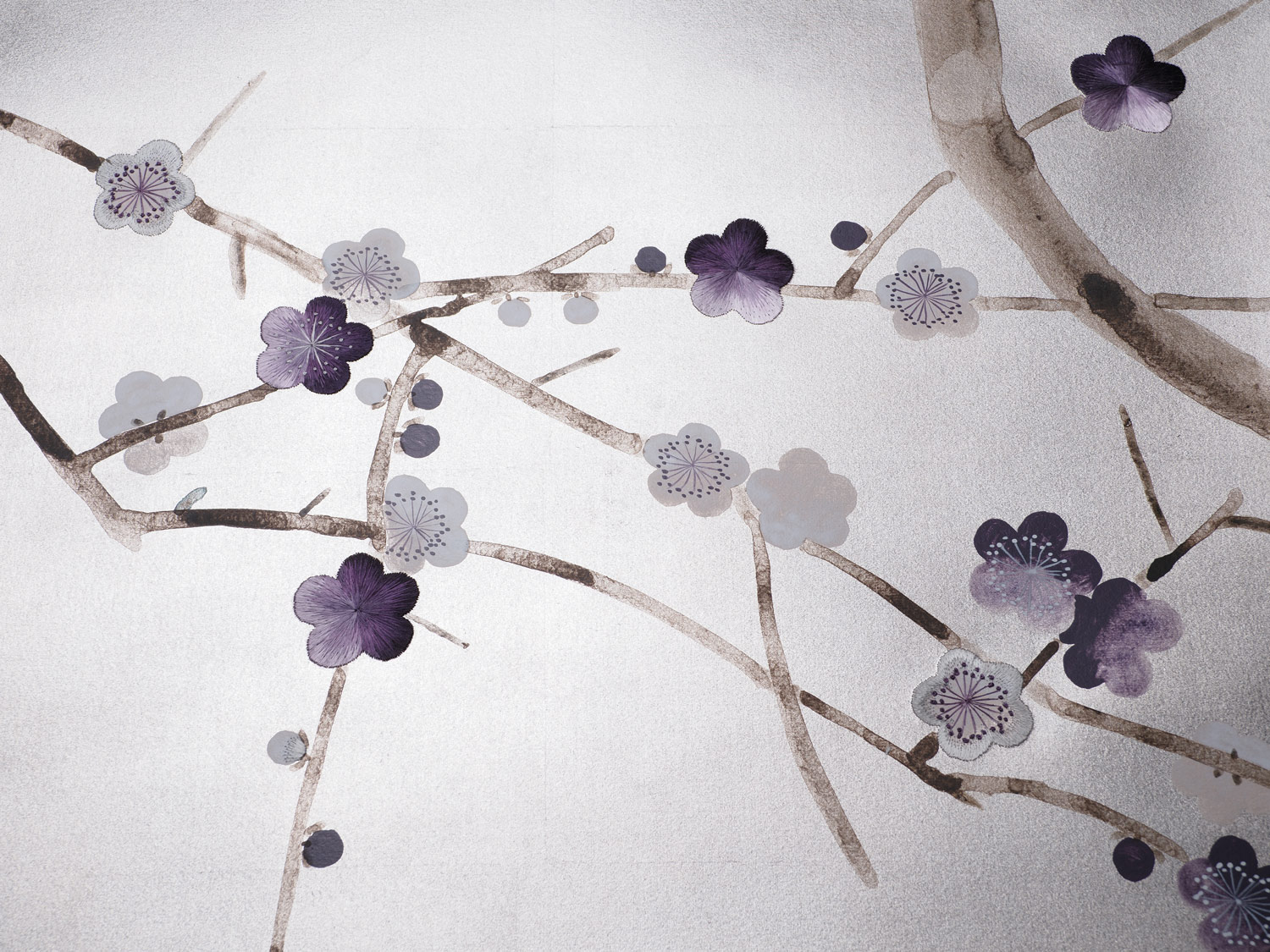Hand-painted wallpaper. Original colourway on Tarnished Silver gilded paper.
