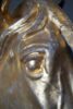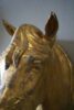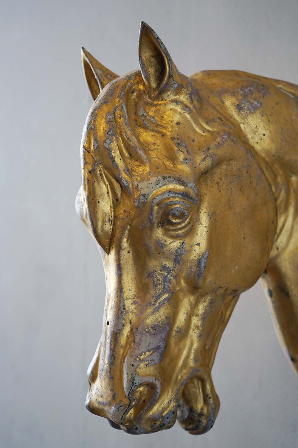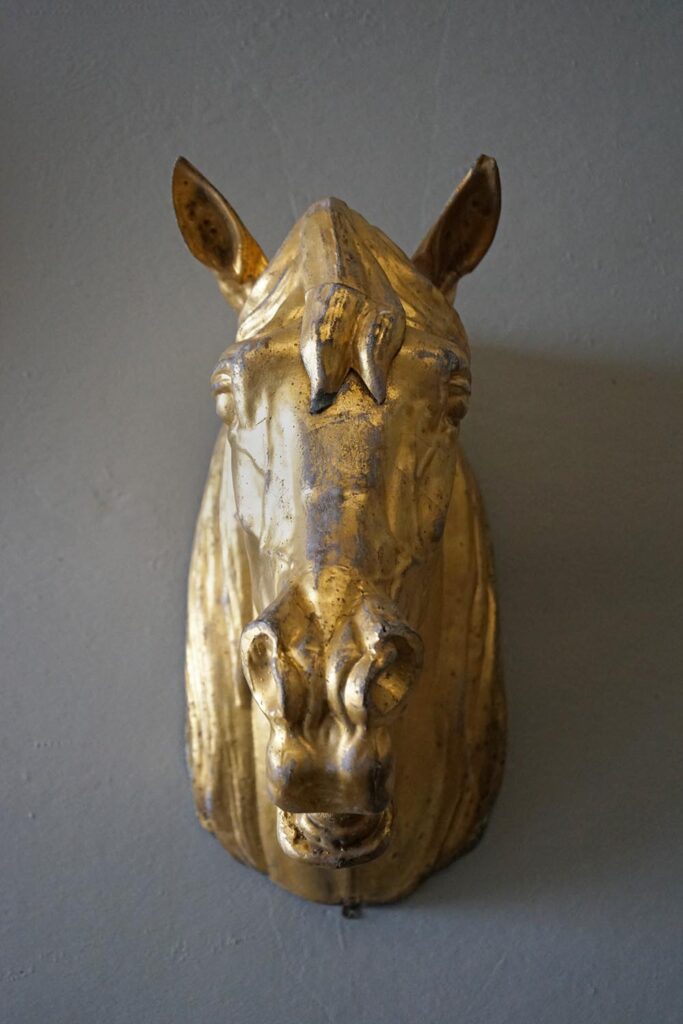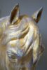 A rare zinc horse head with its original gilding showing superb patina. Pair available.