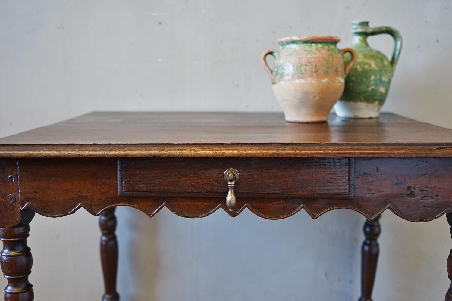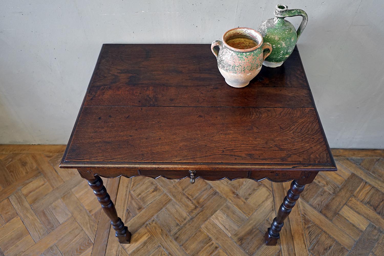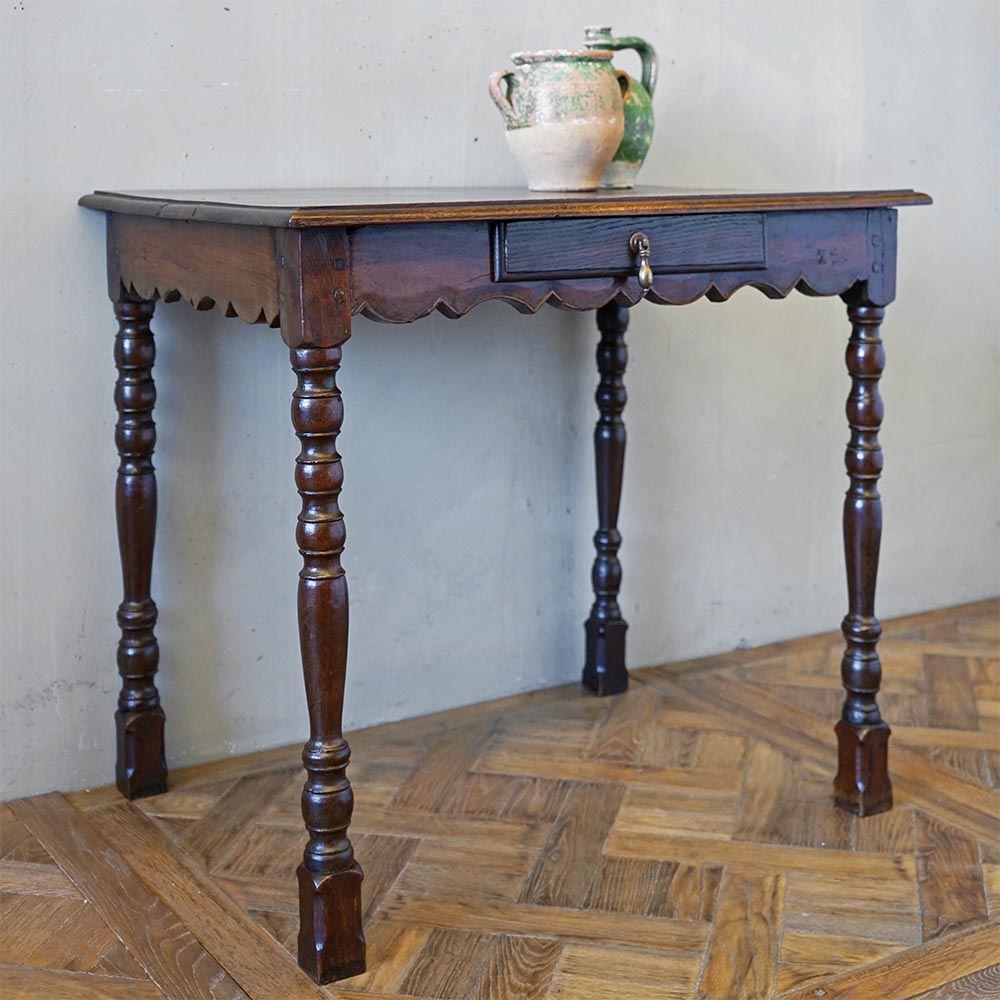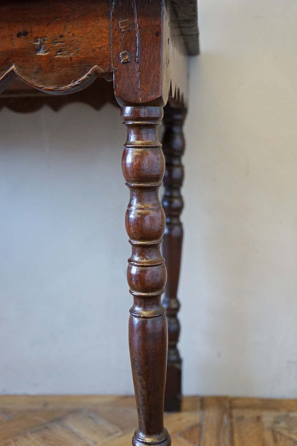 A highly decorative Louis XIV period oak side table with scalloped apron and turned legs. Excellent condition and good patina. A rare model, originally from our own personal collection from the Chateau de Saussignac.
