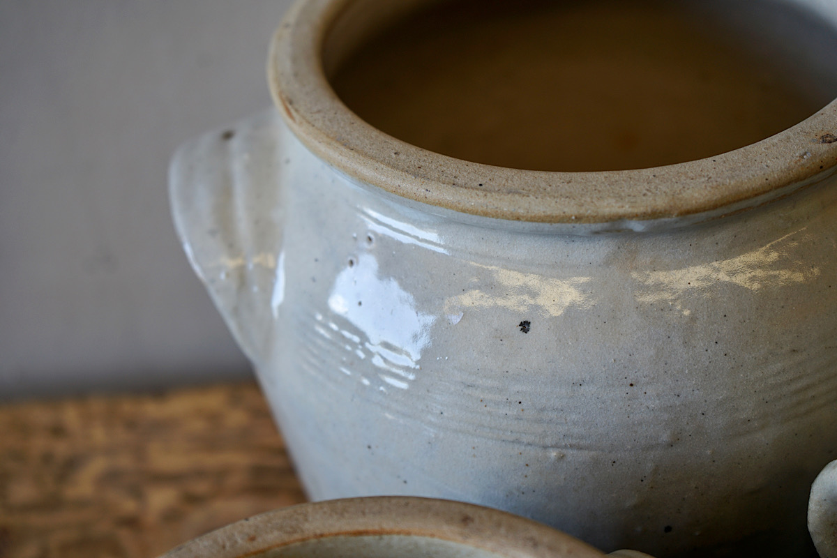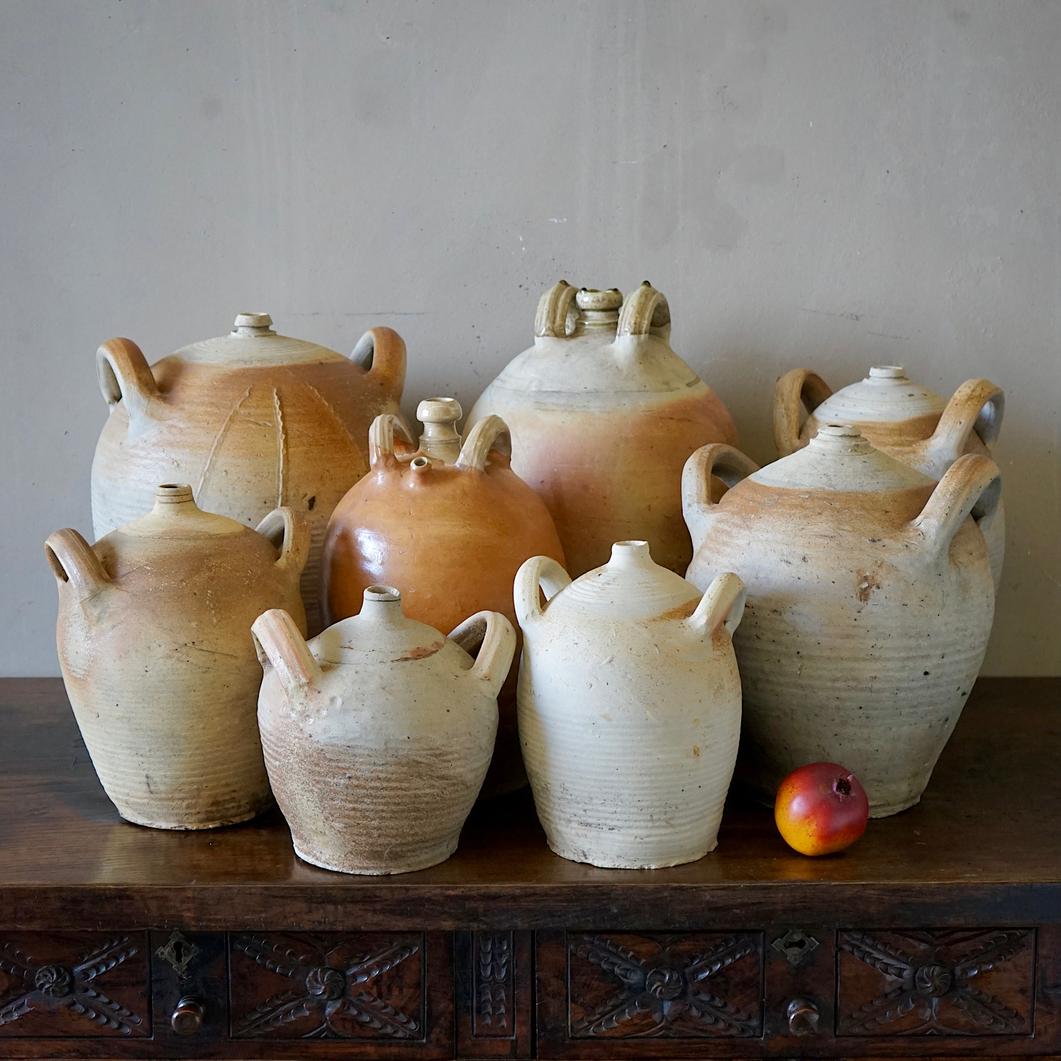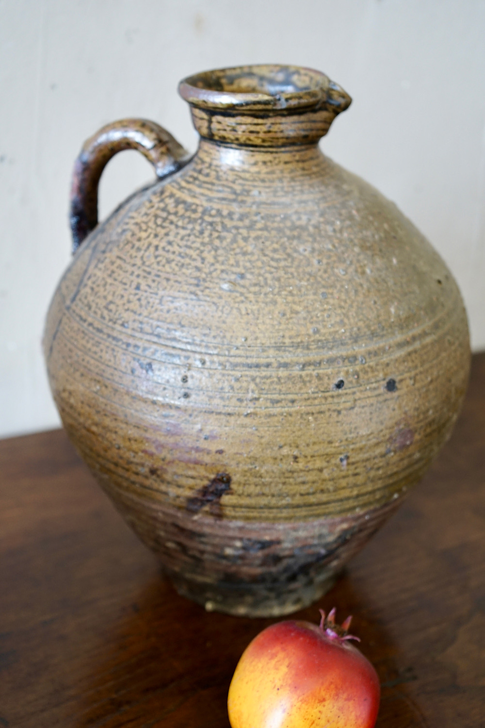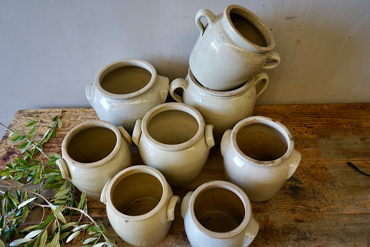 A collection of 3 French provincial earthenware oil jars. Lovely organic colours, firing defects, ribbed surface and matt patina. Priced and sold separately.