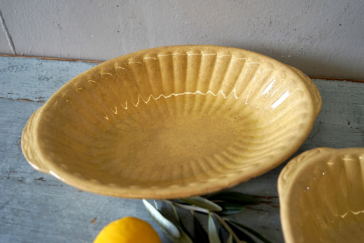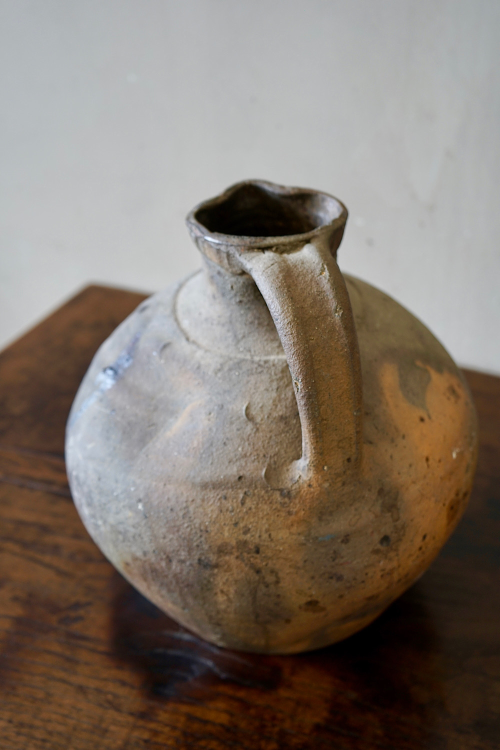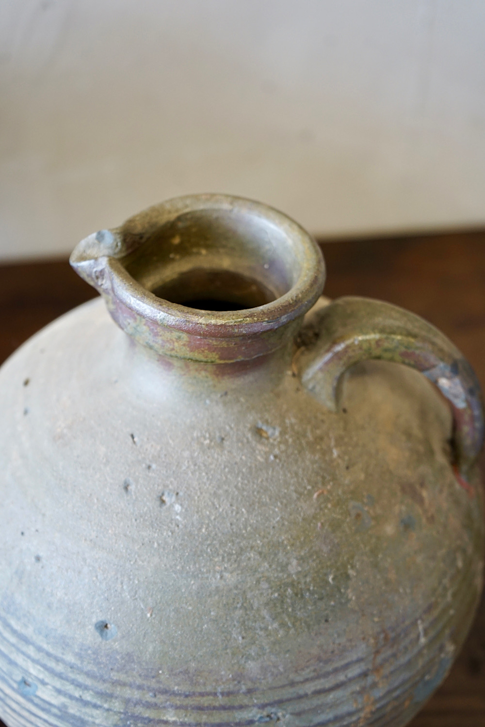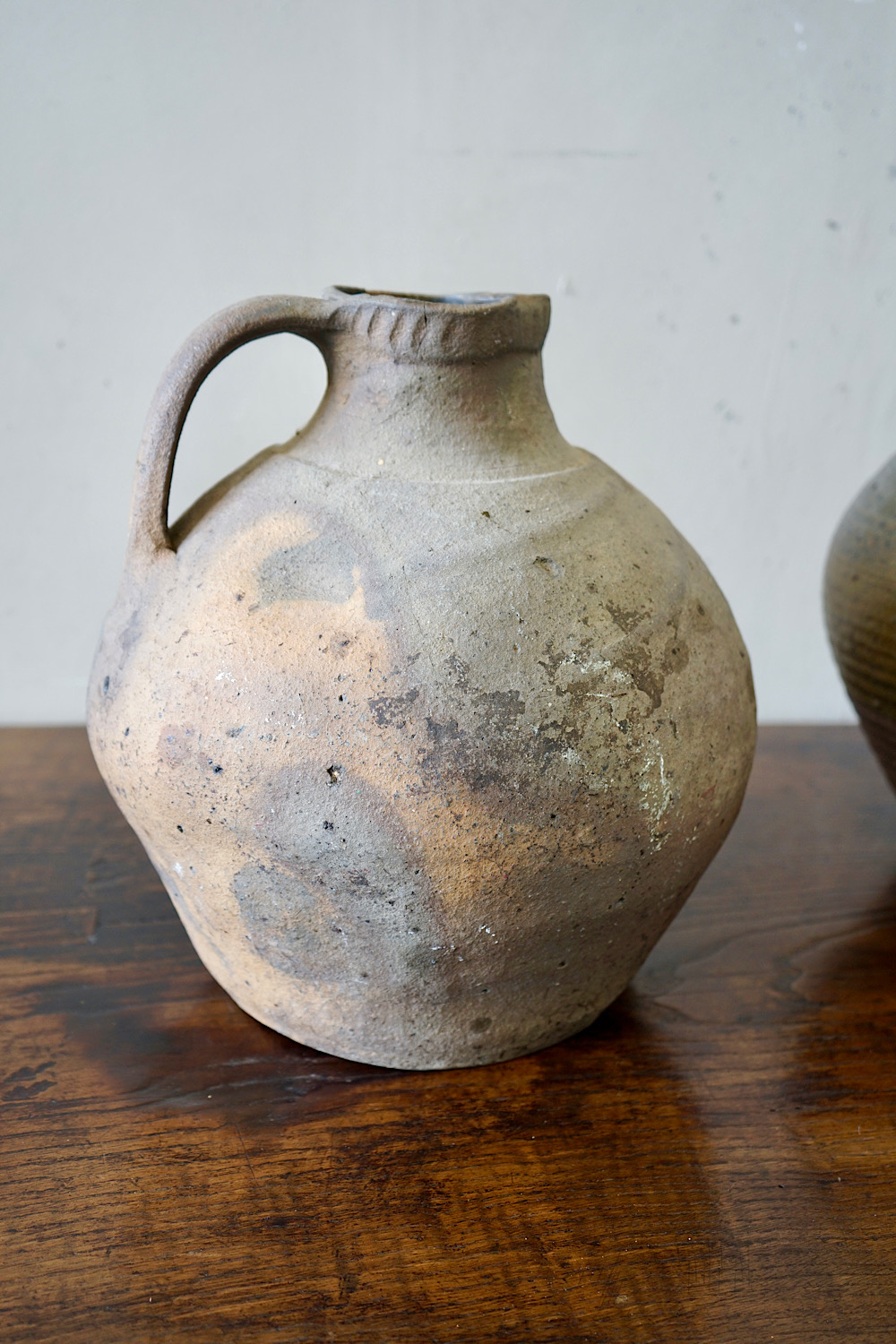 A collection of 3 French provincial earthenware oil jars. Lovely organic colours, firing defects, ribbed surface and matt patina. Priced and sold separately.
