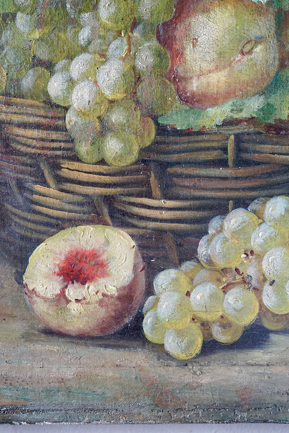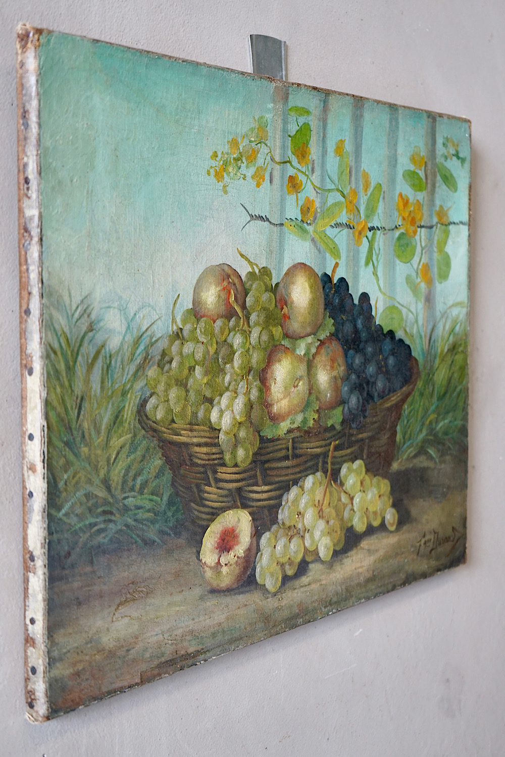 A very decorative unframed oil-on-canvas still life painting of fruit, signed Frederique Durand in lower right corner. A beautifully executed work in excellent condition. Lovely decoration for a kitchen or dining area.