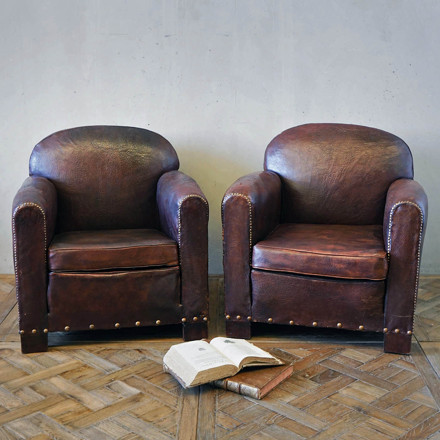 A pair of leather club chairs in good condition. Chocolate brown leather with excellent patina and large brass dome studs, raised on wooden feet. (Sold as a pair.)