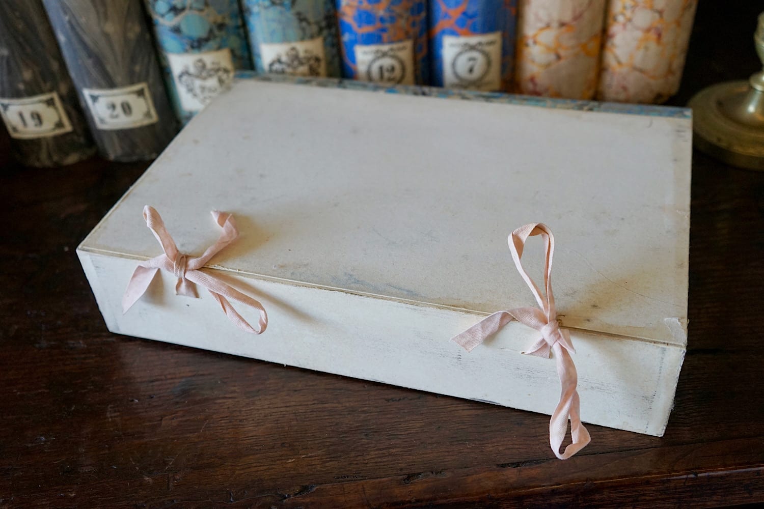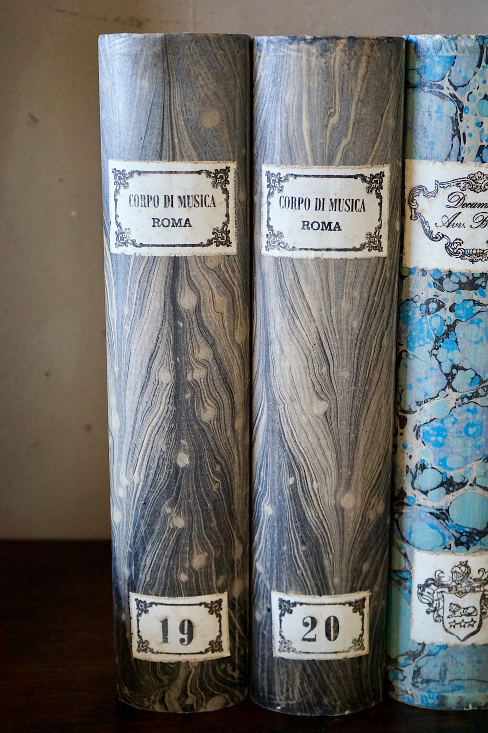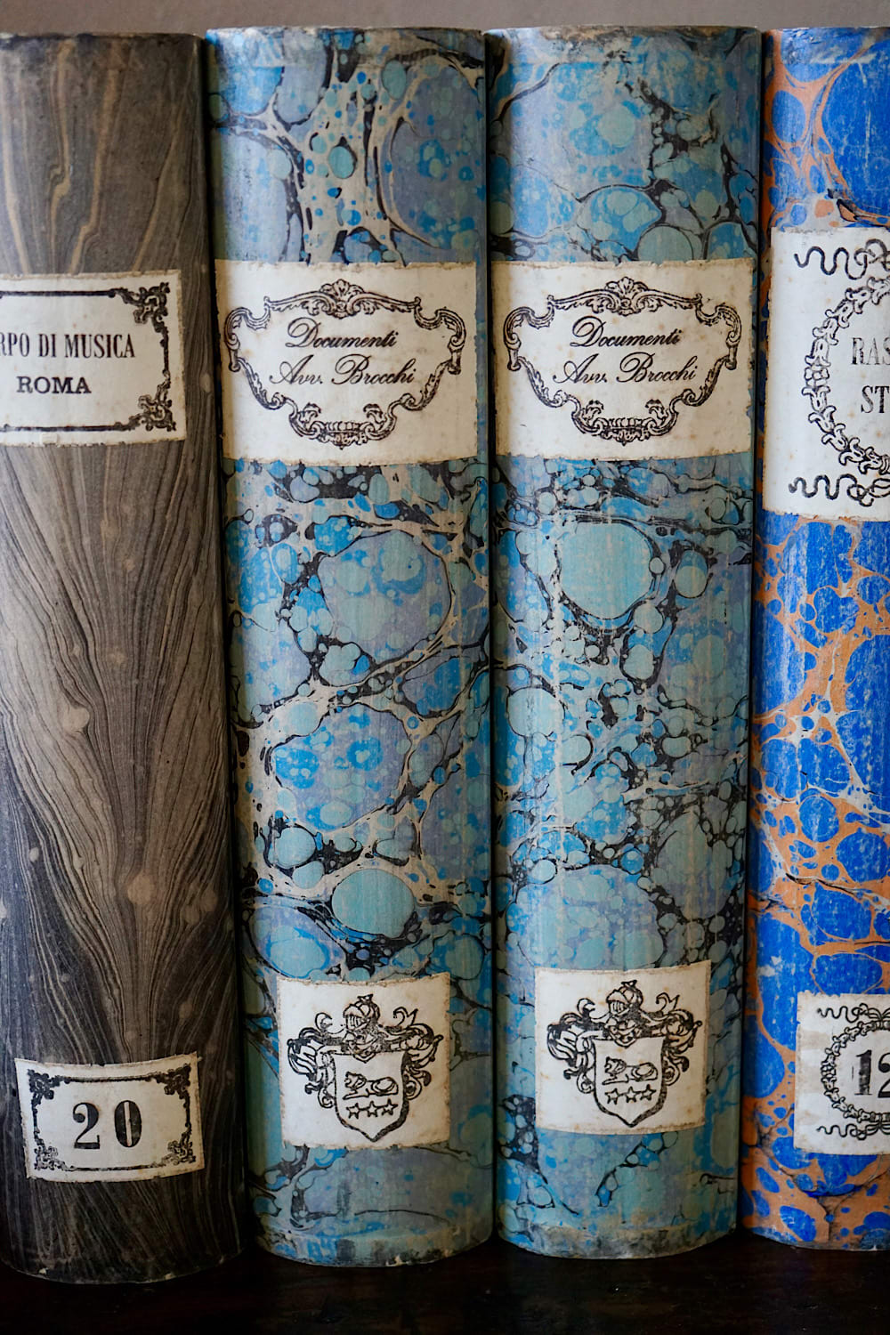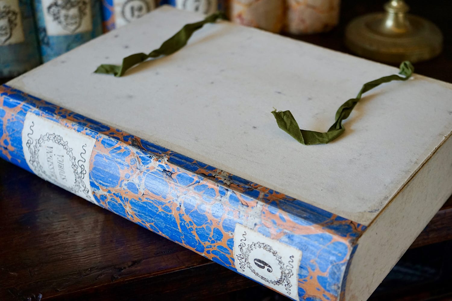 A collection of highly decorative Italian foolscap document boxes in the form of large old antique books. Made of wood and heavy card with colourful hand-marbled spines and fabric ties. Ideal for storing A4 documents, photographs and other small items. Priced and sold separately.