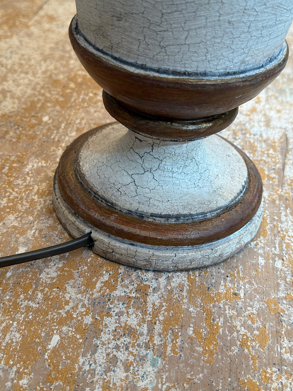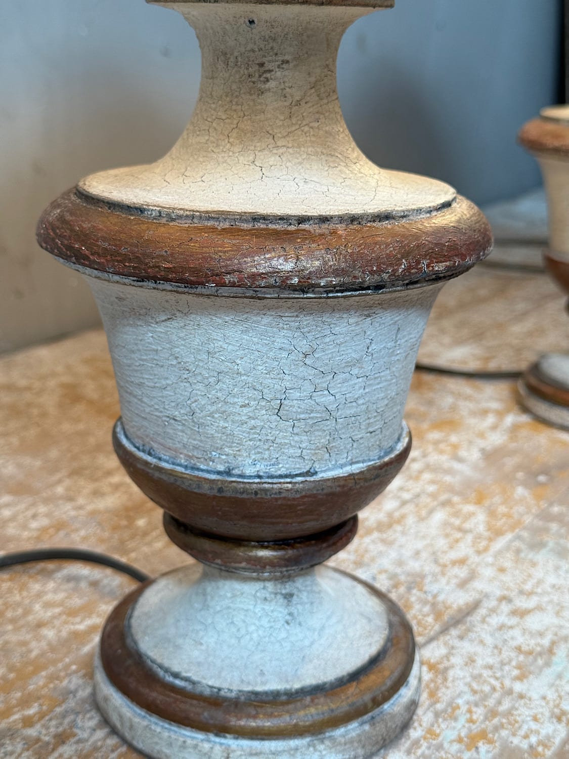 Italian turned wooden baluster-form lamps in the style of antique candlestands. Aged paint and gilding showing attractive patina and tin drip trays. Electrified to NZ standards. Sold with plain linen shades. Priced and sold separately.