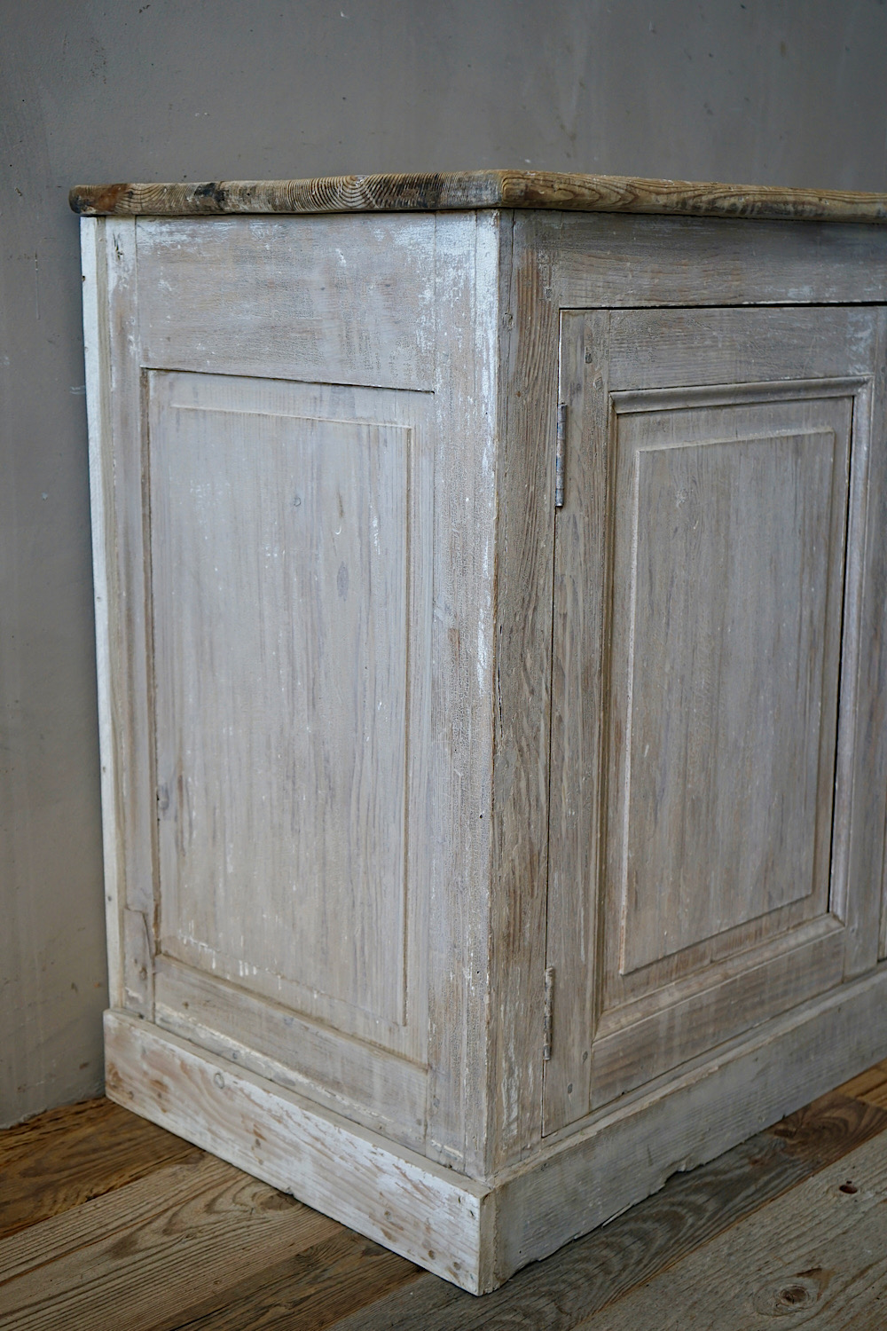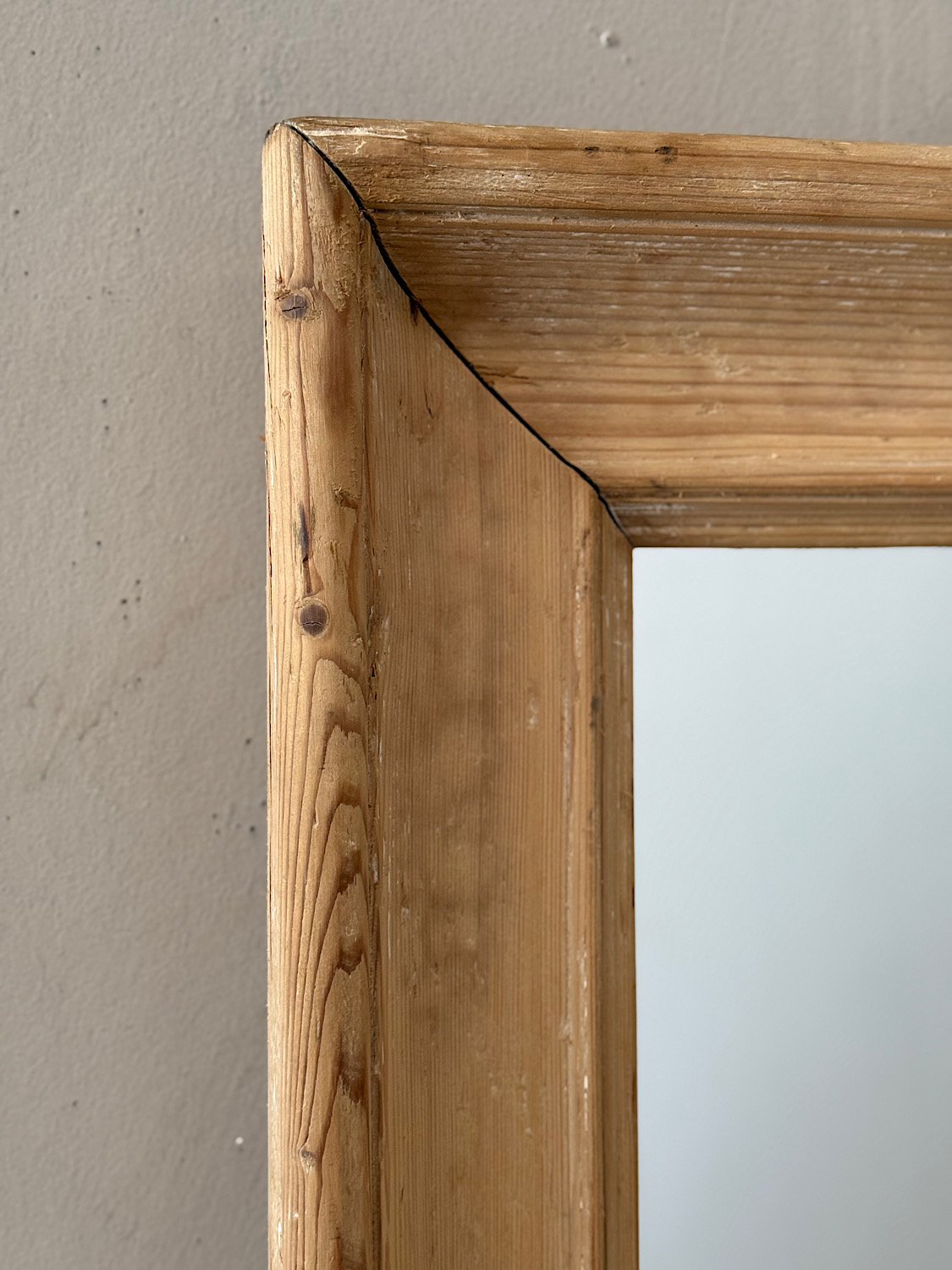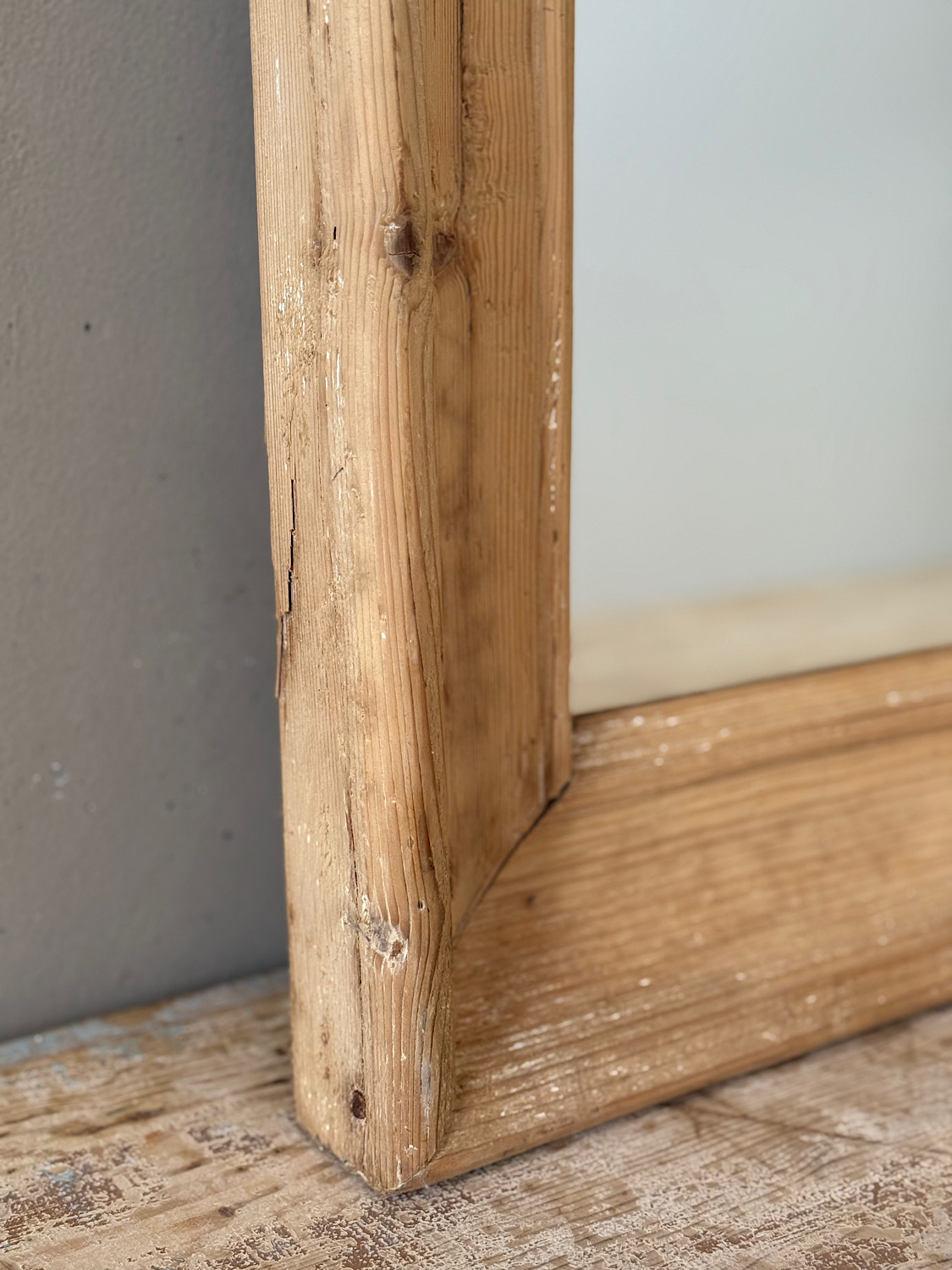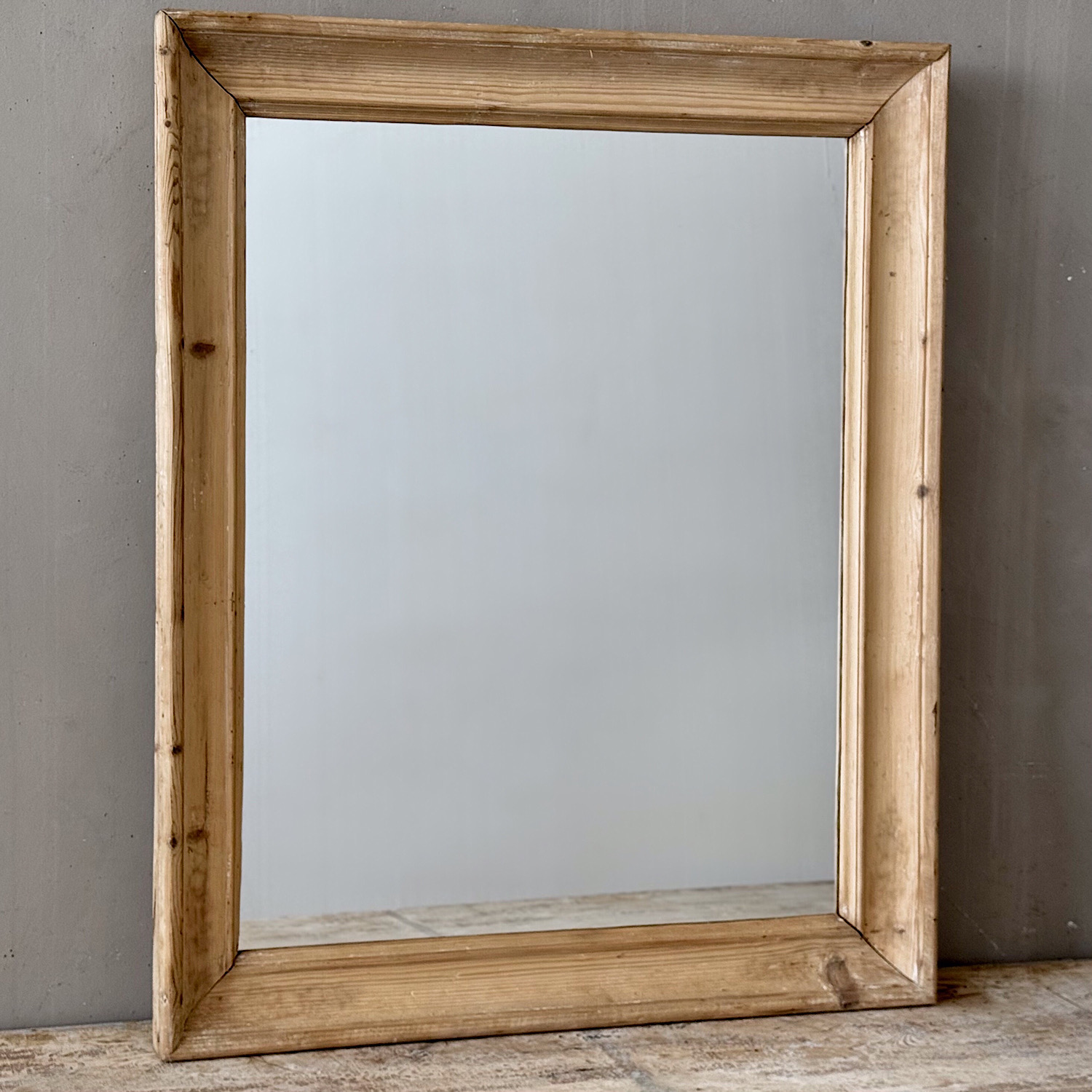 An antique French mirror with frame in bare pine, with lovely weathered patina. Can be hung portrait or landscape format.