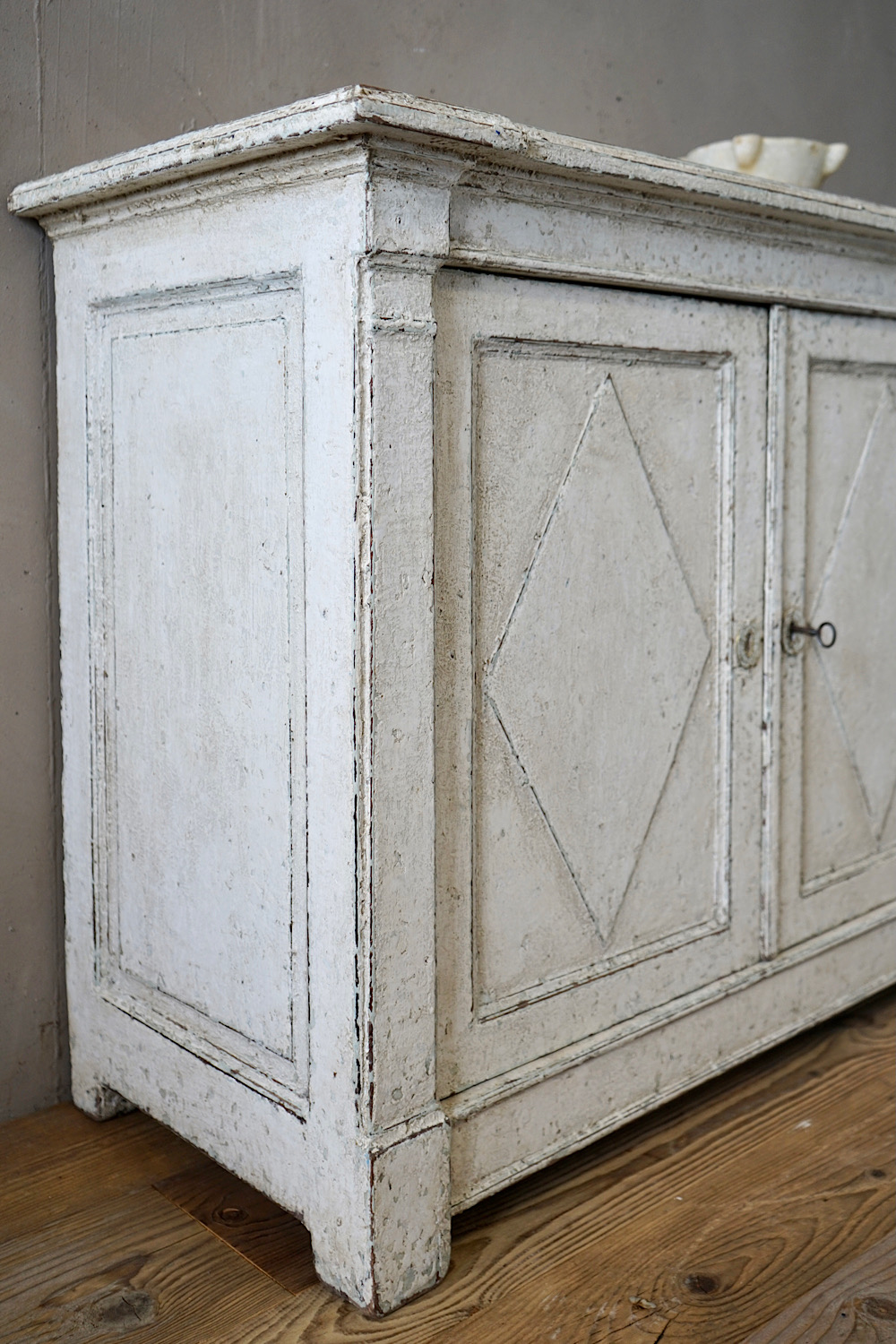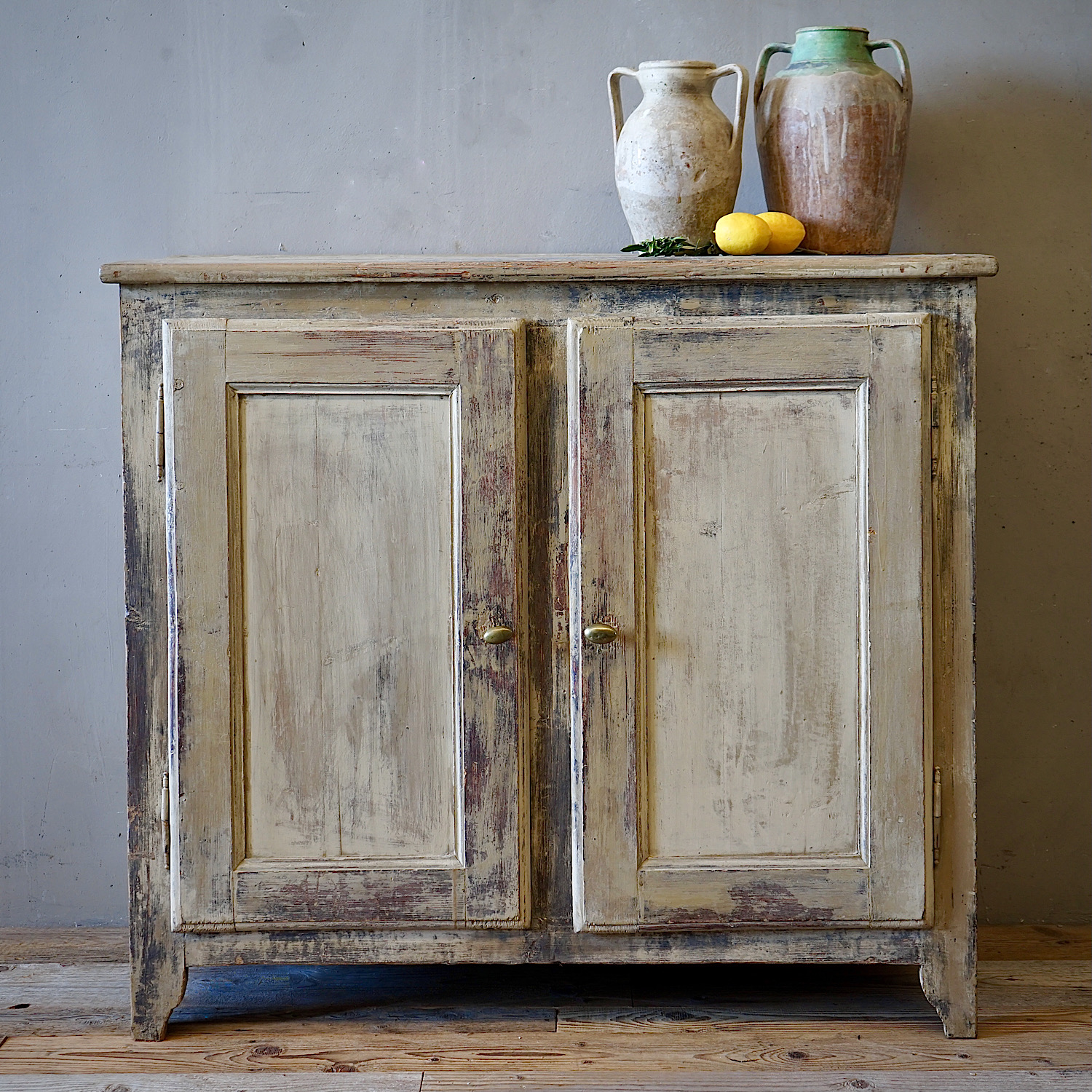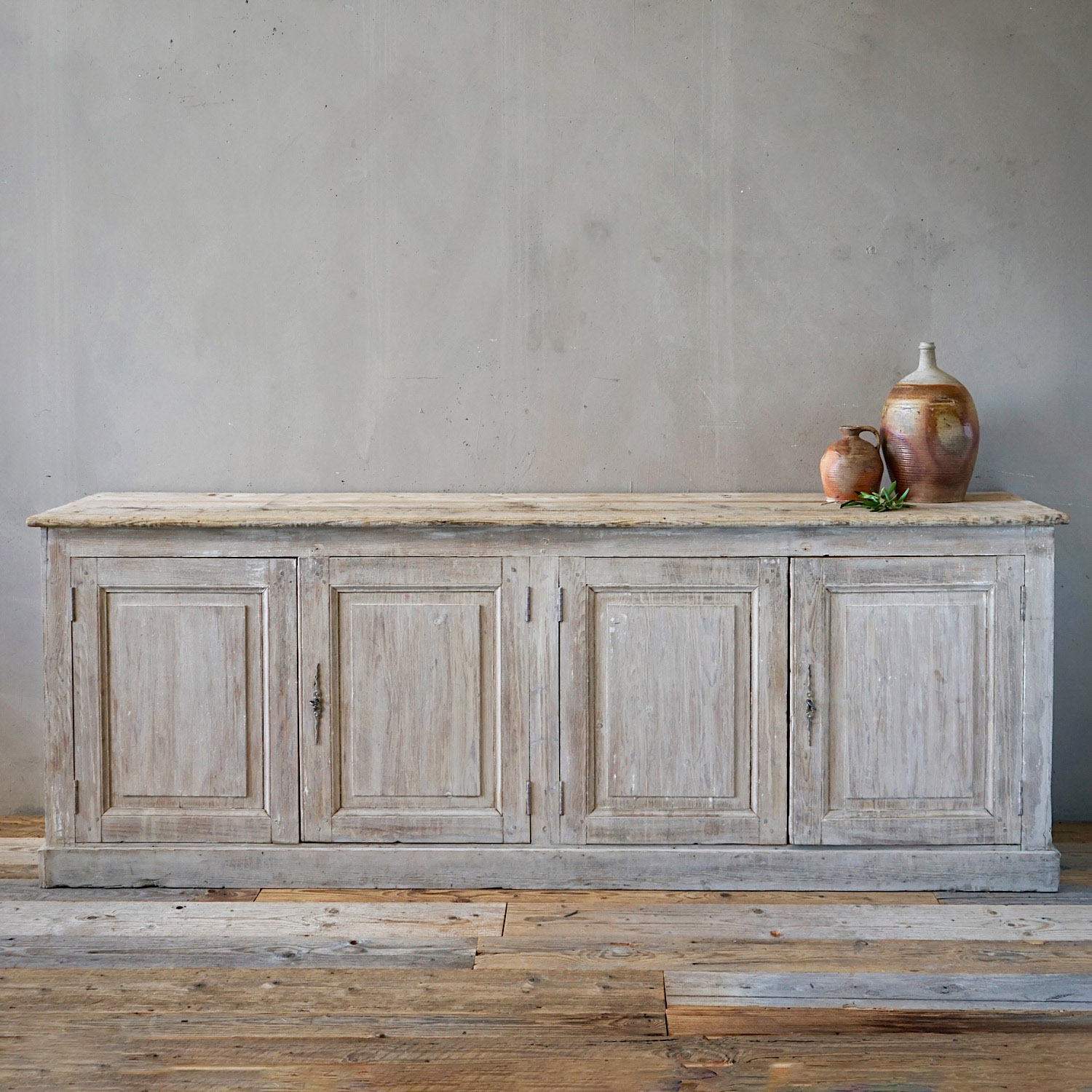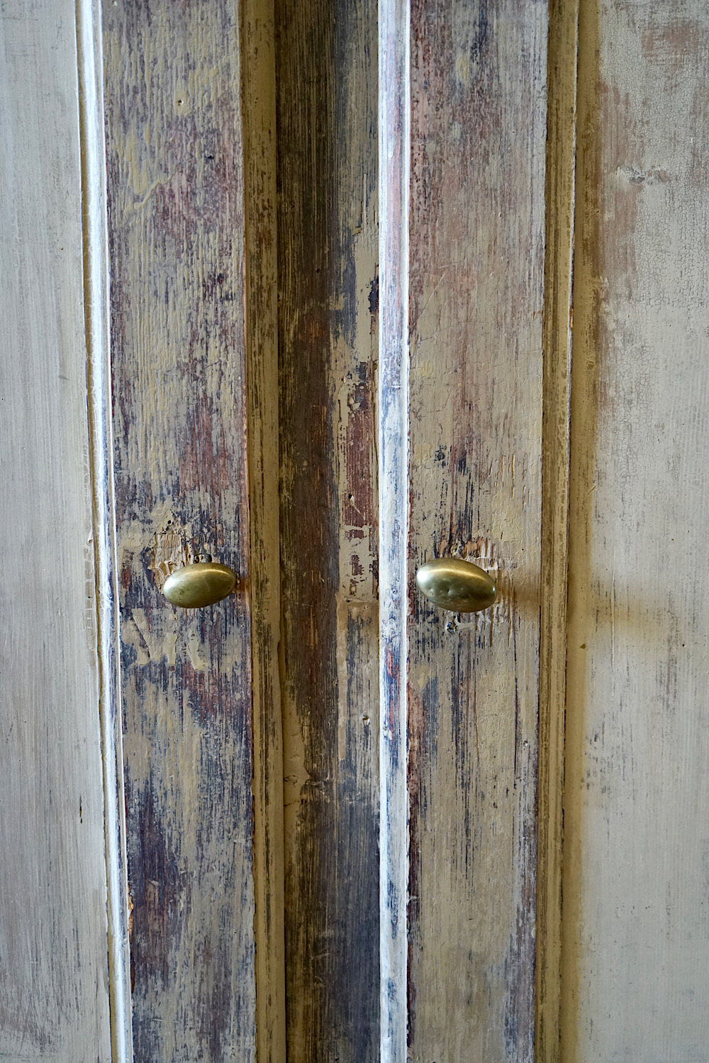An antique French mirror with frame in bare pine, with lovely weathered patina. Can be hung portrait or landscape format.