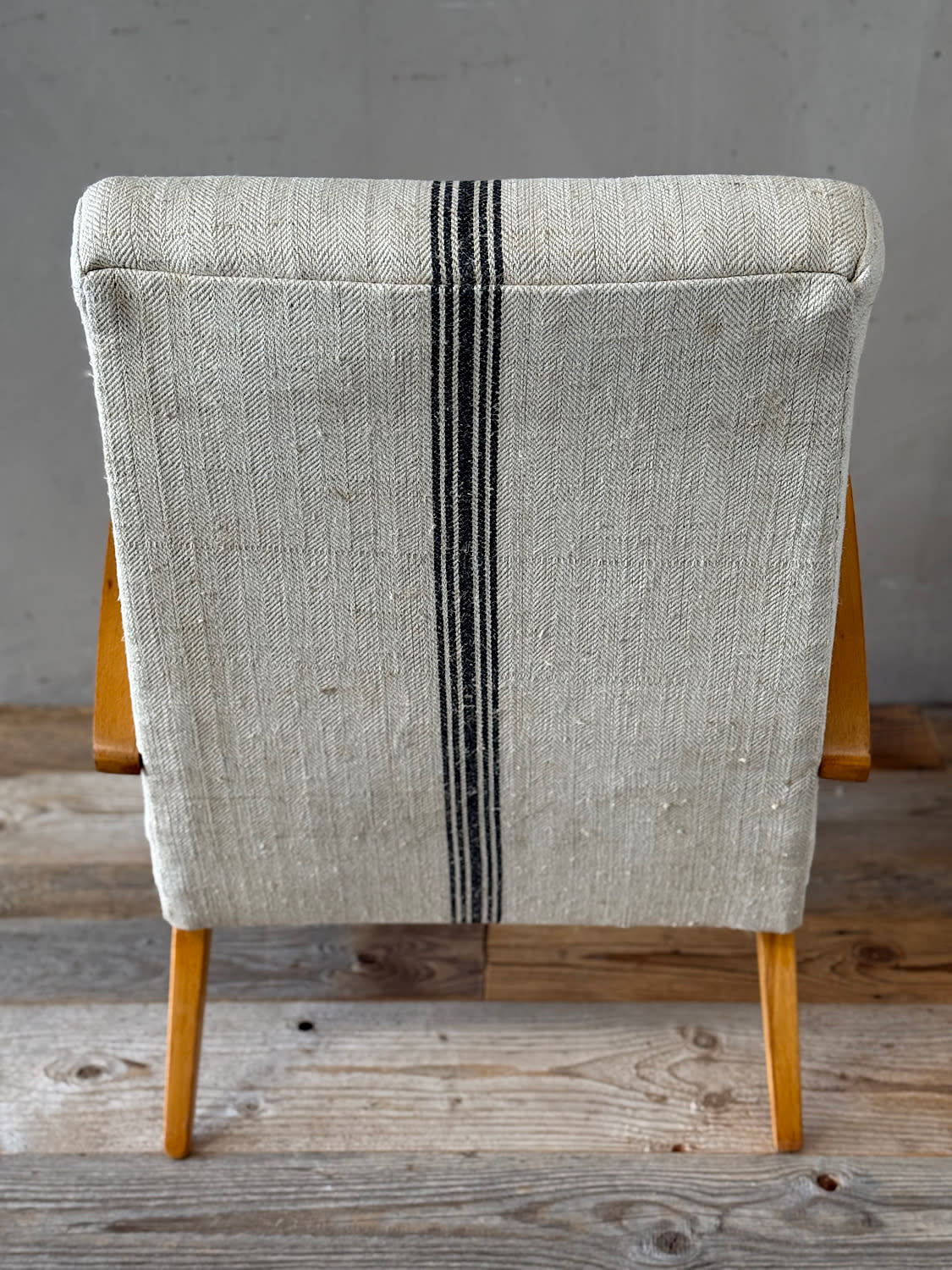 A striking pair of upholstered bentwood armchairs by mid century designer Frantisek Jirak for Czech furniture manufacturer Tatra. Bentwood frames in perfect, solid condition, newly recovered in vintage striped hemp giving a relaxed, nostalgic feel. A real statement in any chic lounge or living room. Priced and sold as a pair.