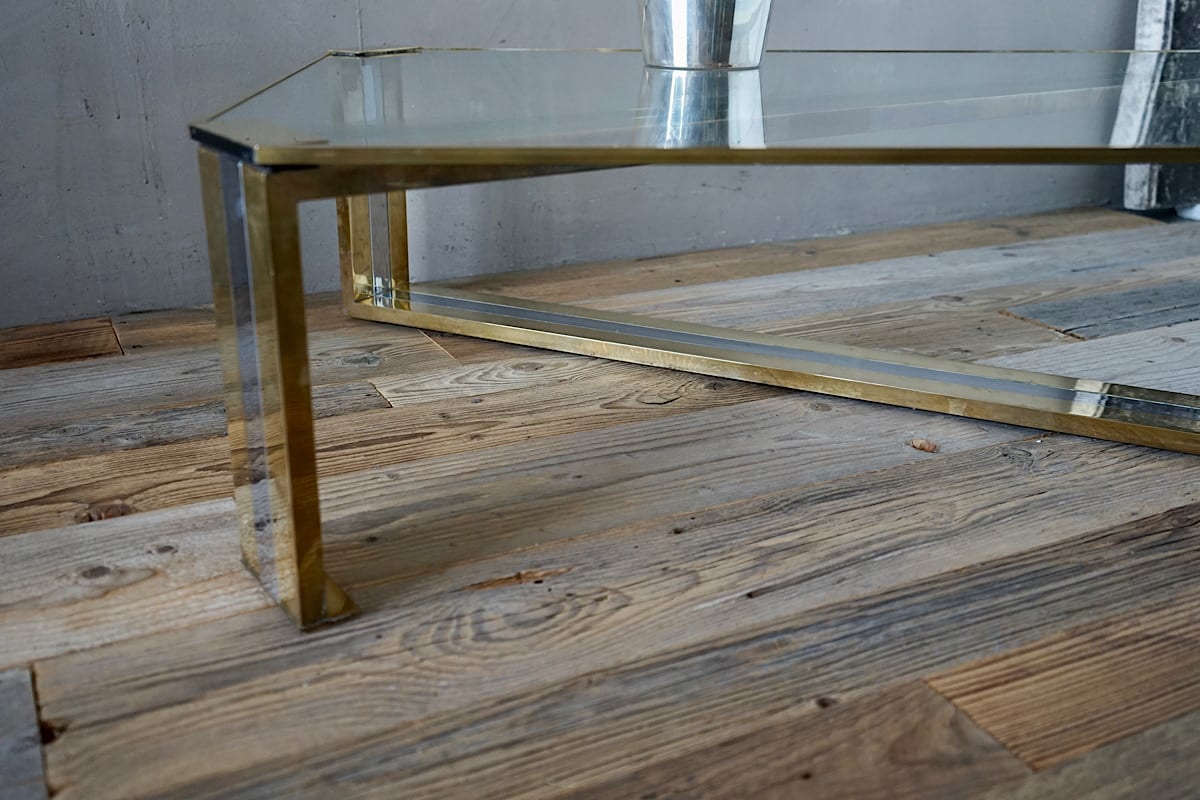 A good quality mid-century modern coffee table in chrome, brass and glass, made by Italian designer Romeo Rega. Excellent condition. Very striking design.
