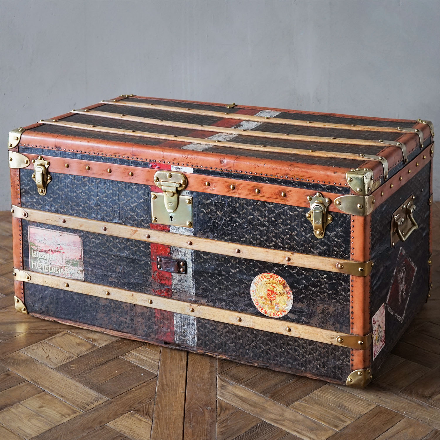 A rare Goyard trunk in good, original condition. Hand-printed canvas and brass lock, latches, corner brackets & handles. Light brown lozine edging. Good patina all over and remnants of old travel labels. Thought to be originally belonging to the Rainier family of Monaco, with the in-house Goyard personalising showing the flag of Monaco around the centre of the trunk and a crown on each end in red & white, identical to that of the Royal Rainier monogram, above the initial “R”.