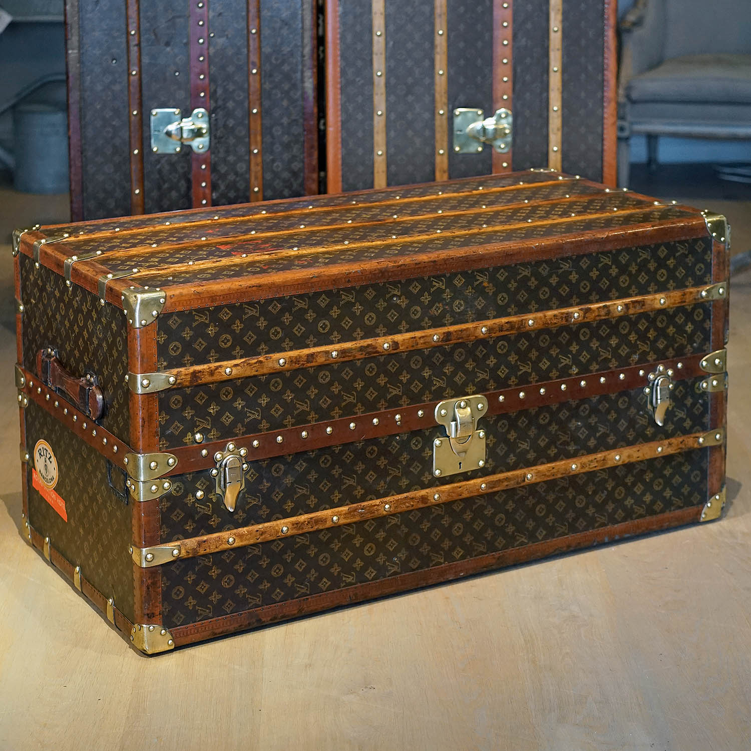 A rare Louis Vuitton twin wardrobe trunk in excellent, original condition. Hand-printed monogram canvas and all brass lock, latches and corner brackets. Light brown lozine edging. Complete with interior label, and serial number 774400.