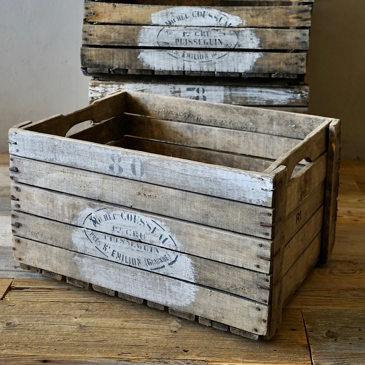 A vintage wooden grape-harvesting crate from St Emilion. Four available.